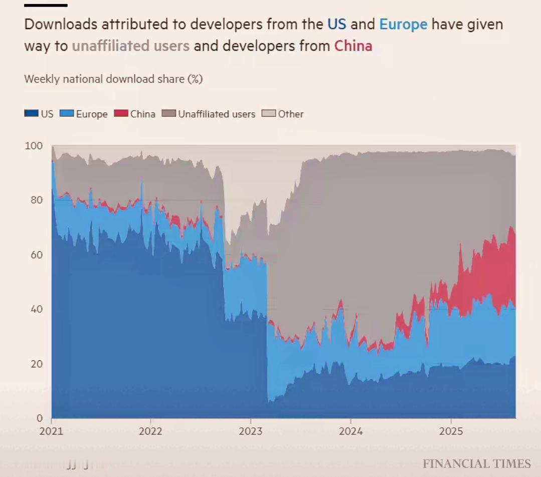国外媒体报道! 又一次实现对大国的超越! 据英国《金融时报》报道,东方大国在开源AI模型的全球市场份额已正式超越美国,跃居第一。依据麻省理工学院(MIT)和Hugging Face的最新研究,过去一年里,东方大国团队开发的开源AI模型下载量占比达17%,首次超过美国的15.8%,荣登全球榜首。 报告显示,东方大国采用“开源共享”的发展战略,而美国却是“闭门造车”,二者形成了鲜明反差。或许有人会问,这有什么值得欣喜的? 即便开源AI模型排名第一又怎样?实际上,此次反超被众多专家学者视为一次历史性的突破,是大国人工智能领域发展的又一重要标识,也是一次具有关键意义的进展。 网友说:从被卡脖子到反超登顶,开源AI这波逆袭太提气!美国还在搞技术封锁,咱直接用共享破局,这格局差得不是一点半点! 你对此有何看法? 中国AI应用为何能跑出全球速度