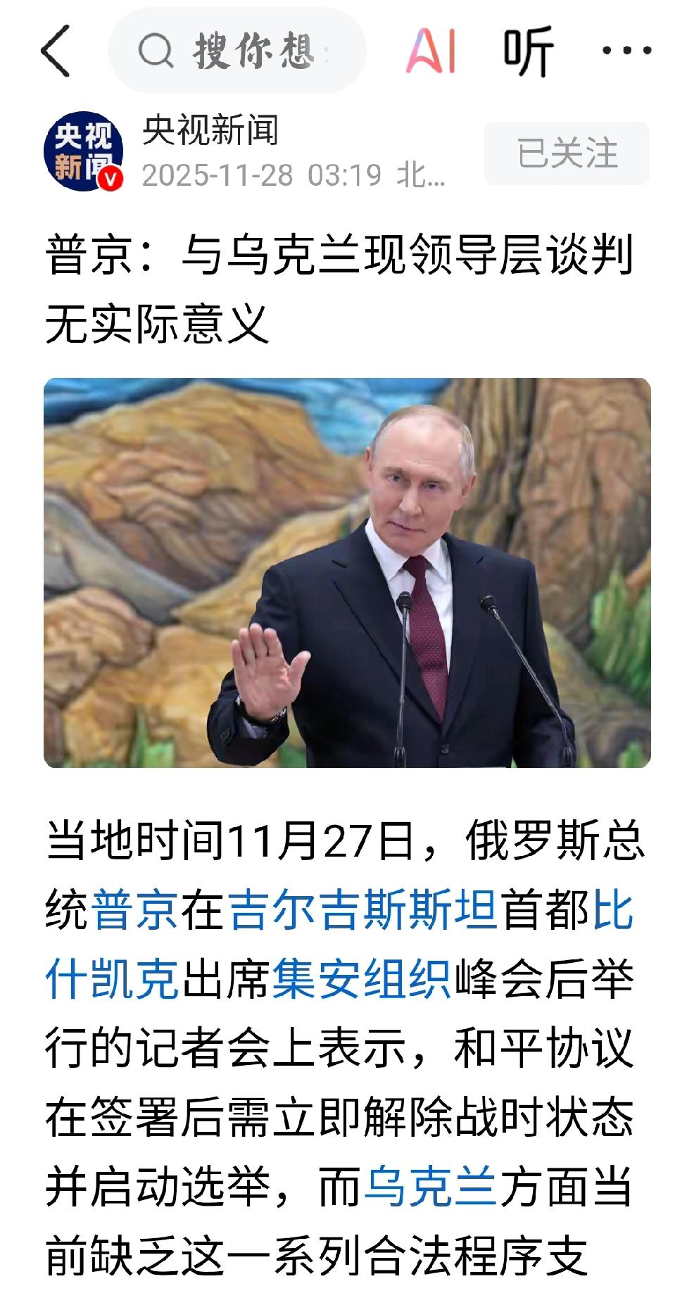 普京:一语道破真相 个人观点:与乌克兰现领导层谈判无实际意义,这是普京洞察真相的判断。 因为乌克兰现领导层所做的一切,都是为了继续战争。无论多少回?无论是谁组织?谁参与?最后和平谈判结果是纠结不断,无法执行。已经取得暂停作用,给了乌克兰喘息的机会,给了乌克兰重新获得援助,重新组织军队,重新开火的条件。 除非乌克兰现领导层集体罢免,否则战争继续。 美国面临乌克兰逐渐失控的局面。 这也难怪美国总统特朗普在社交媒体发文,痛骂泽连斯基的原因。 因为泽连斯基破坏了美国的布局,导致美国无法将力量集中于亚洲。 美国的五个手指,每一个都力大无穷,但是偏偏就无法形成一个拳头,都是各自为政,都是以自己为中心。 这是美国的先天缺陷,无法改变。