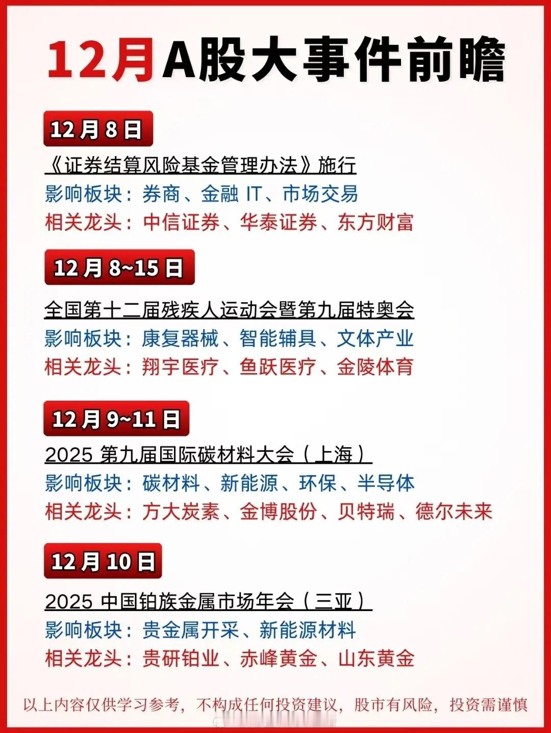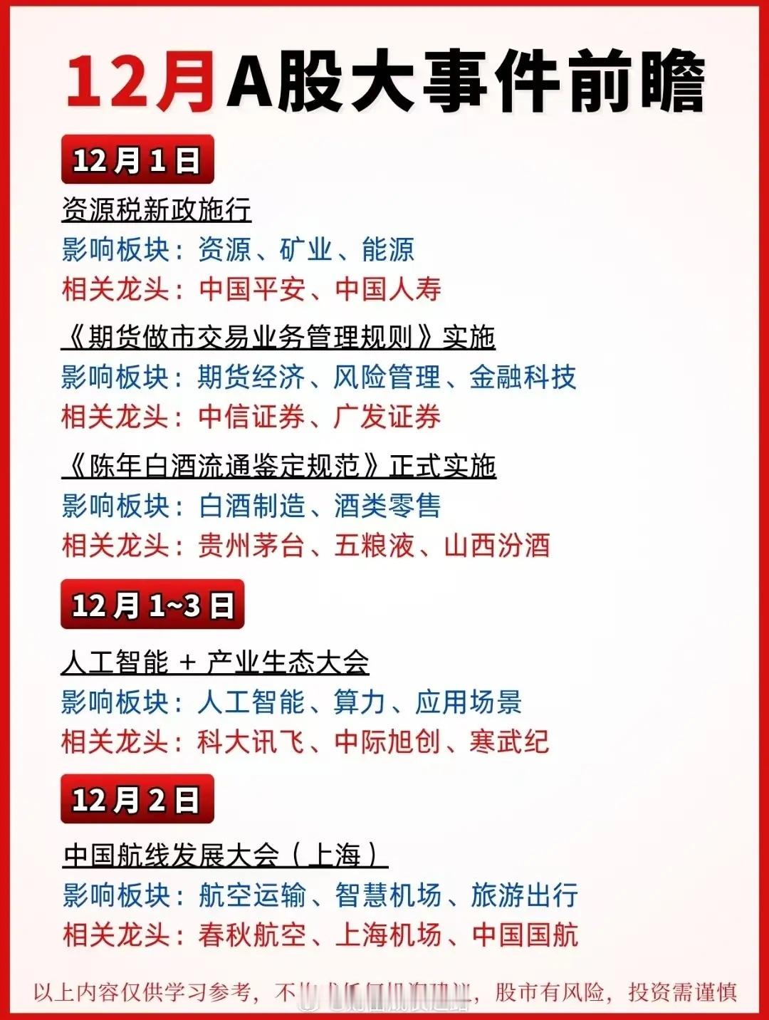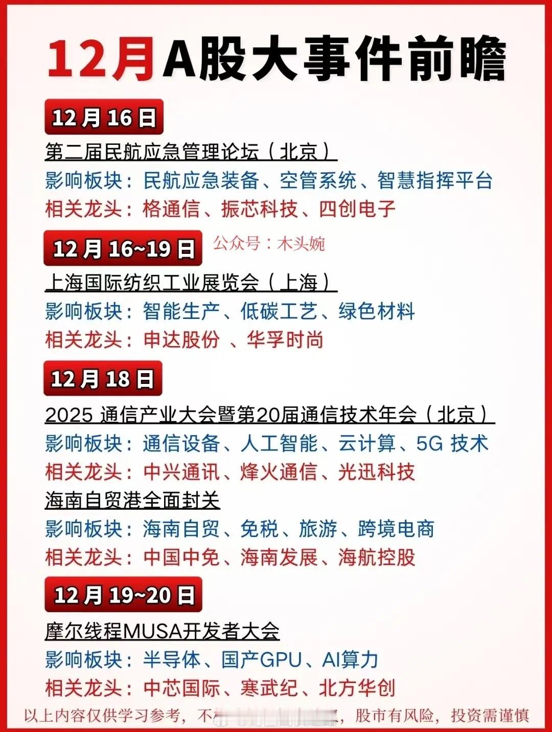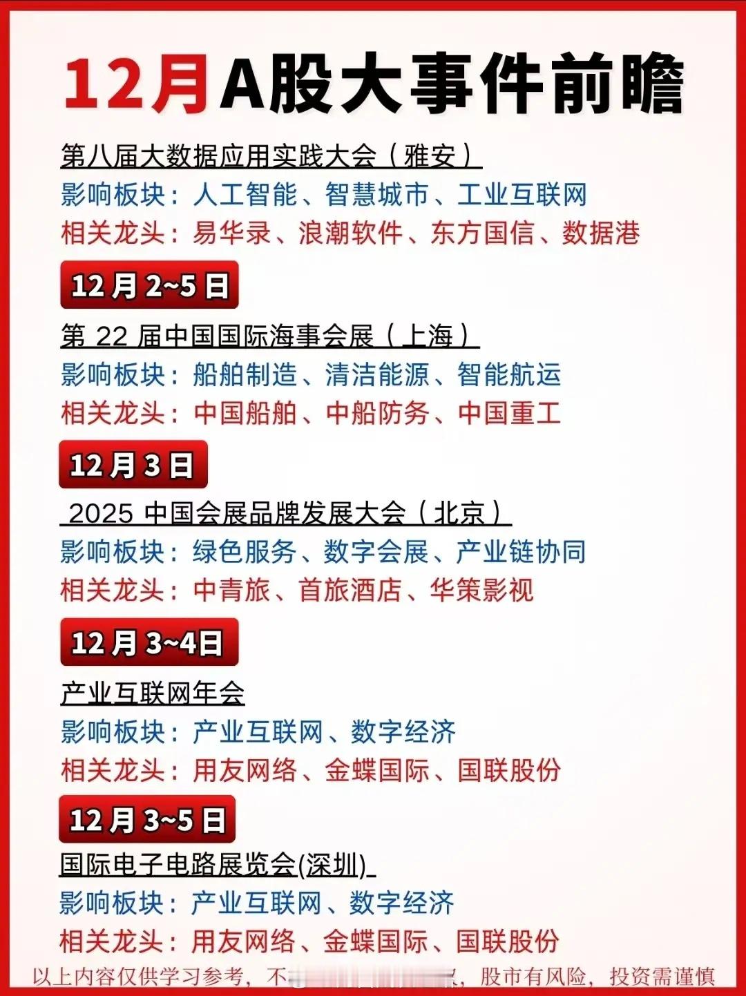 十二月重大财经事件提前看!根据公开资料显示,十二月份值得关注的财经事件有人工智能产业生态大会、大数据应用大会、产业互联网年会、算力产业大会、通信技术年会、世界风能大会、海南自贸港封关等等,相关事件题材概念龙头代表有哪些?(1)2025“人工智能+”产业生态大会由中国互联网协会主办,将于12月1日 - 3日在北京中关村举办,人工智能龙头代表有科大讯飞、浪潮软件等等。(2)2025算力产业生态高质量发展大会定于12月11日在北京举办,大会主题为“协同·跃升·赋能”。算力概念龙头代表有数据港、中科曙光等等。(3)2026年度全国煤炭交易会将于2025年12月3日 - 5日在山东日照召开,主题是保障煤炭安全稳定供应。相关概念龙头代表有陕西煤业、中国神华……理财有风险入市需谨慎!資料全网公开透明,仅供参考不能作为投资依据。