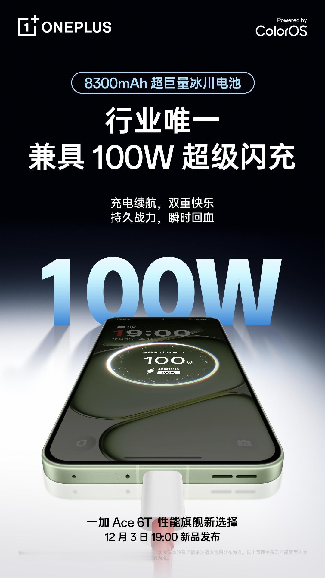 【一加Ace 6T搭载8300mAh冰川电池】据一加中国区总裁李杰介绍,一加Ace 6T将全球首发8300mAh超巨量冰川电池,是目前全球电池容量最大的性能旗舰,正式引领旗舰手机电量进入8000+mAh时代。此外,一加Ace 6T还首发搭载高通第五代骁龙8移动平台,配备金属中框,还有1.5K165Hz高刷屏,游戏体验拉满。目前市面上主流的FPS电竞手游,Ace 6T全部支持原生165超高帧模式,配合新一代风驰游戏内核、冰河散热系统以及行业领先的陀螺仪,该机将于12月3日正式发布。