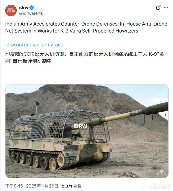 印度正在为K-9“金刚”自行火炮研制防无人机棚,不过这图片是用AI改的,右下角还能看到水印。