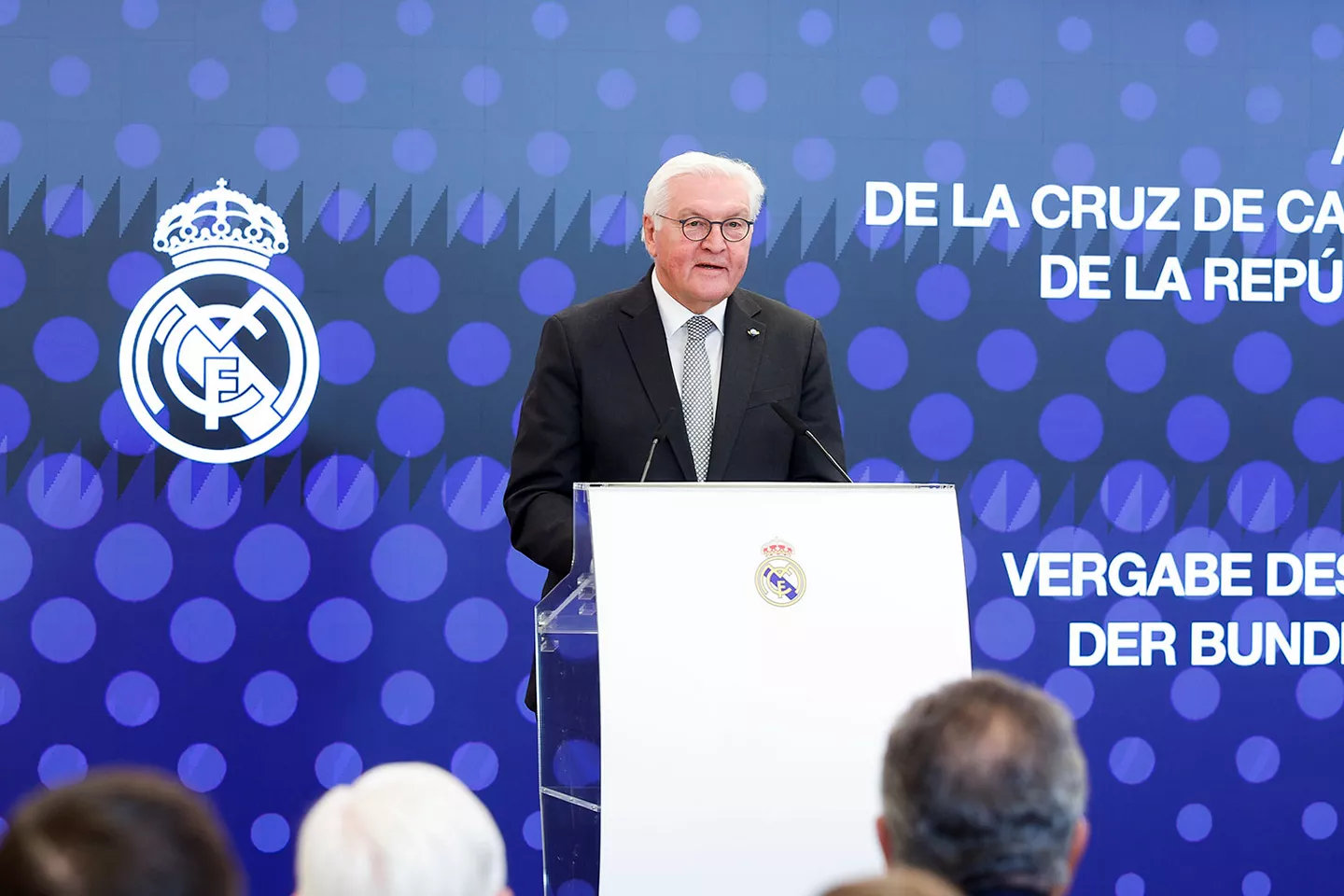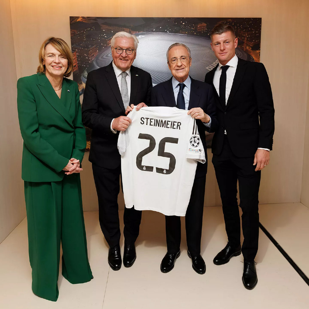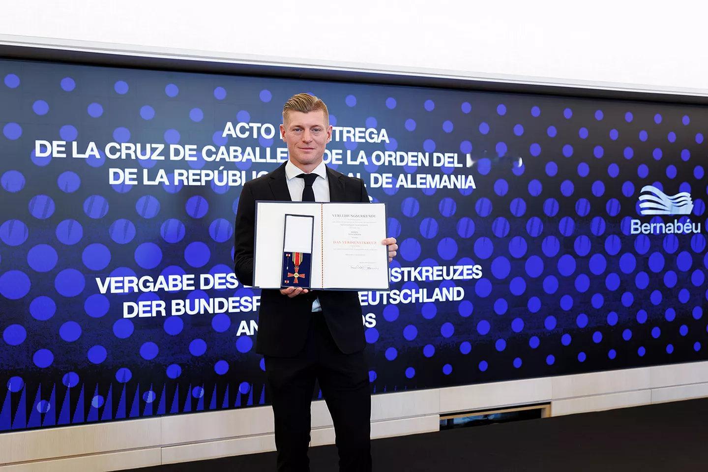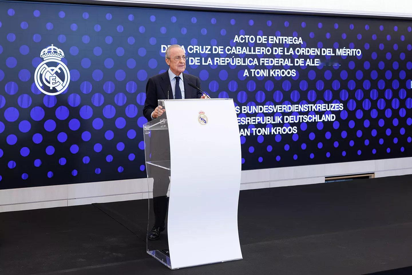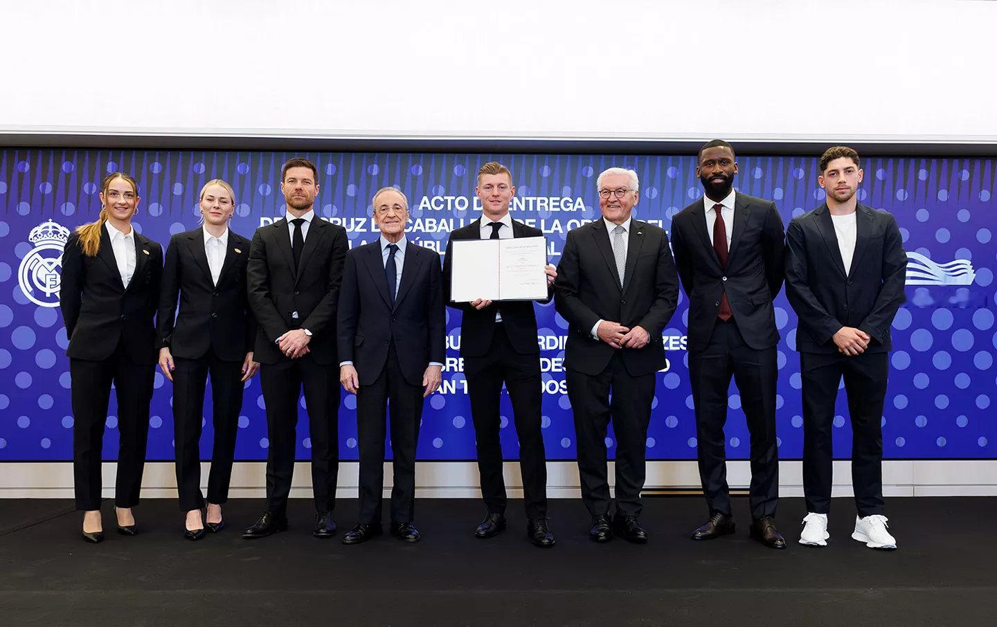 弗洛伦蒂诺:“我们非常荣幸地欢迎德意志联邦共和国总统以及来自这个我们无比珍视的伟大国家的全体代表团成员莅临我们的球场。尊敬的总统先生,我们衷心感谢您选择在伯纳乌球场为我们俱乐部最伟大的传奇人物之一,我们挚爱的克罗斯颁发这一荣誉。”“对我们而言,他是皇马在全球范围内所代表价值观的典范。在他身披皇马战袍的10个赛季里,他始终是勤奋、奉献、坚持、谦逊、尊重和团结的典范。此外,他还做出了非常重要的贡献:他帮助我们加强了德国和西班牙两国之间的联系。”一位伟大的体育绅士“我们都为你今天从贵国总统手中接过的这份勋章所代表的意义深深感动。今天,这位伟大的体育绅士将获得德意志联邦共和国功绩骑士十字勋章。我们这些欣赏过他对足球的理解的人都知道,我们有幸见证了史上最伟大球员之一的风采。”“克罗斯在职业生涯的巅峰时期退役,他曾随皇马在温布利这样传奇的球场赢得欧冠冠军,并代表德国国家队参加了上届欧洲杯。”骄傲与敬佩“亲爱的托尼,我们为你感到无比自豪,也为你能在这座你无比热爱的球场上获得祖国的这份认可而感到骄傲。你在这里为我们奉献了无数令人难忘的足球。你赢得了所有看过你比赛的人的心,我想让你知道,作为皇马主席,能与你一起经历我们历史上最辉煌的时期之一,是我的荣幸。”“今天,您获得了祖国的认可,同时也永远赢得了我们的爱戴和敬佩。感谢您为皇马所做的一切。也感谢你与妻子杰西卡十年前共同创立的基金会所做的慈善工作。我们都由衷感谢该基金会为身患重病的儿童所做的贡献。亲爱的托尼,祝贺你获得这项殊荣,要知道,皇马现在是,将来也永远是你的家。”克罗斯halamadrid