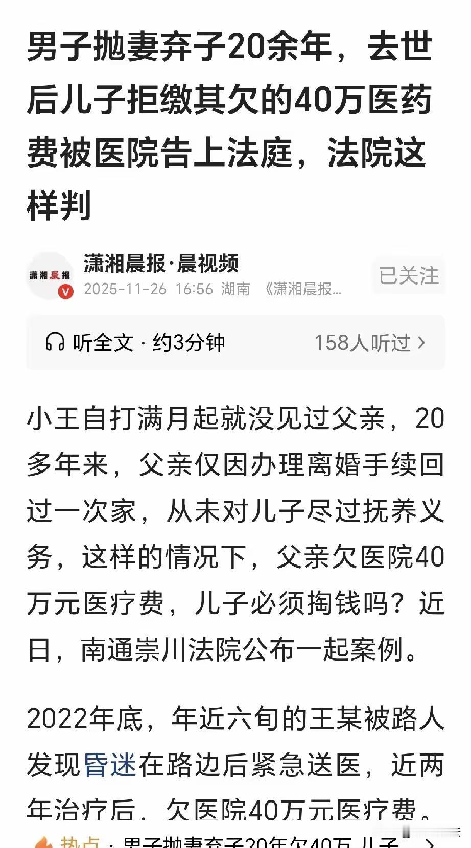 你提供的这两个案例都涉及到遗产债务的继承责任问题,结合《民法典》的相关规定,可以做如下分析和解答: 一、案件背景总结 老王在年轻时离家多年,未尽抚养义务,最终在60岁左右因病倒地酒店治疗,欠下巨额医疗费。 老王的儿子小王从未与父亲有过有效联系,也没有承担过任何抚养或赡养责任。 老王去世后,医院依法向小王追讨该笔医疗费,小王律师主张自己无责任。 法院依据《民法典》第1161条判定:医疗费为被继承人的债务,由遗产清偿;继承人应在遗产范围内承担,遗产不足时,各应自负不足部分。 小王明确声明放弃继承,法院仍认定他为法定继承人,应清理遗产、偿还债务。 二、法律规定说明 《民法典》第1161条:继承人以遗产的实际价值为限承担债务责任。 继承人放弃继承的,不承担被继承人遗产中的债务(除非其承诺或特别承担义务)。 遗产管理人(即继承人)有义务清理遗产,偿还债务。 三、分析要点 继承责任的范围: 继承人只在遗产范围内承担债务责任。 小王虽曾声明放弃继承,但作为法定继承人,仍有清理遗产、支付债务的义务(即使他自认无责,法律上仍具有责任)。 债务的性质: 医疗费是被继承人的个人债务,应由遗产偿还。 遗产不足支付债务时的责任分担: 根据法律,遗产不足的,继承人应自行承担不足部分。 放弃继承的效果: 如果小王明确放弃继承,是可以免于偿还遗产中的债务,但他应依法声明并完成相关程序,否则仍有法律责任。 四、法院裁判依据 在本案中,法院判定: 小王即使声明放弃继承,也作为遗产的管理人,有责任以遗产范围偿还债务。 因为遗产不足,责任承担到不足部分。 但医院不能以“他没有抚养义务”或“他不愿意”作为拒绝偿还的理由;债务的性质决定了继承人应承担偿还责任。 五、总结 医院要求小王在遗产范围内偿还医疗费,法律依据充分,法院判决合理。 小王所说的自己从未抚养父亲,不认父,是在事实陈述;但法律关系中,债务责任既存且由遗产承担。 继承责任是法律义务,与个人抚养关系无直接关系,除非继承人明确放弃继承。 六、建议 遗产管理人应依法清理财产、偿还债务后,剩余遗产按法定程序进行分割。 继承人若放弃继承,应依法声明,避免承担债务责任。 总结语: 法院的判决符合法律规定,继承人在遗产不足以偿还债务时,应承担相应不足部分;即使声明放弃继承,只要没有明确放弃继承权,仍负有清理遗产的责任,不能以缺乏抚养义务为由免责。彩票到底是真的吗