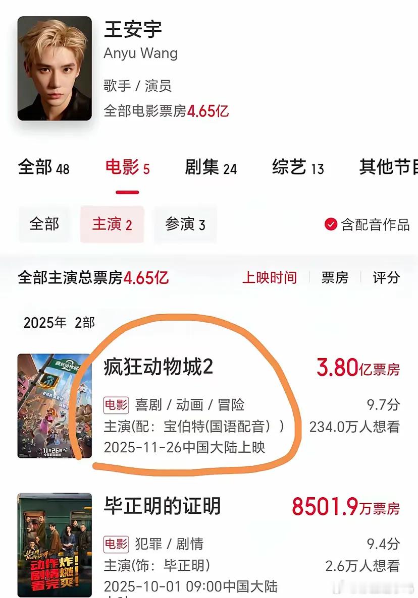 王安宇运气挺好的,因为一部《疯狂动物城2》,个人票房从8000万增至4、5亿了