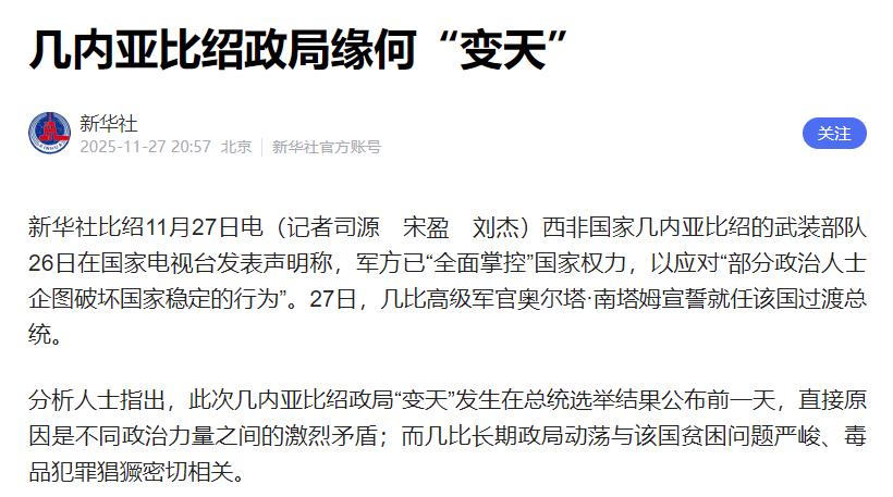 几内亚比绍发生军事政变!而这场风波来得比预想中还要突然,就在全国等着看总统选举结果的前一天,枪声直接打破了首都比绍的平静。   11月26日中午,总统府附近突然响起密集枪声,整整一个小时的火力覆盖后,身穿迷彩服的士兵迅速封锁了通往行政机构的要道,总统乌马罗·西索科·恩巴洛直接在办公室被软禁,连陆军总参谋长、内政部长这些高官也一并被控制住,整个政府的"武装手脚"瞬间被剪掉。   没等民众反应过来,军方就占领了国家电视台,一个叫迪尼斯·恩查马的发言人对着镜头宣布成立"恢复秩序最高军事指挥机关",不仅解职了总统,还解散了所有公共机构、暂停了媒体活动,连海陆空边界都全关了,从当天晚上7点到第二天早上6点实施宵禁。   戏剧性的是,转天也就是27日,高级军官奥尔塔·南塔姆就宣誓就任过渡总统,这夺权速度快得着实让人眼花缭乱。   说起来这场政变也不是毫无征兆,三天前刚结束的总统选举早就埋下了火药桶。   12个候选人里,现任总统恩巴洛和独立候选人费尔南多·迪亚斯·达科斯塔咬得特别紧,计票还没个准数呢,俩人就各自宣布自己赢了,一个说拿了65%选票,一个说自己才是真赢家,支持者们在街头互相叫板,气氛紧张得像拉满的弓弦。   军方在声明里也直言,就是因为这些政客搞事,还有人跟毒枭勾结操纵选举,他们才不得不出手接管。但说穿了,这不过是几内亚比绍老毛病的又一次发作。   这个国家自1974年从葡萄牙独立后,就没怎么太平过,光成功的政变就有9次,未遂的更是数不清,恩巴洛2020年上台后这才5年,就已经发生3次未遂政变了。而之所以总这么乱,说到底还是穷出来的毛病。   几内亚比绍人均GDP常年在900美元上下徘徊,工业基础几乎没有,连粮食都没法自给自足,是联合国盖章的最不发达国家之一。穷到这份上,政局能稳才怪。更麻烦的是,它还偏偏坐在了毒品走私的"黄金路线"上。   西非海岸线漫长,不少无人岛都成了毒贩的中转站,从南美来的可卡因经这儿转道欧洲,每年都有巨额黑金流入。这些钱早就渗透到了军警和政界,形成了盘根错节的利益网,所谓的政治斗争,很多时候就是在抢这些黑产蛋糕。   而军队和政治搅在一起,今天你上台明天我夺权,就像个没完没了的恶性循环。现在军方控制了局面,但外界都在看着西非国家经济共同体会不会出手制裁,联合国秘书长也急着呼吁恢复宪法秩序。   可对普通老百姓来说,不管谁掌权,日子该难还是难。毕竟在这个连选举结果都能被枪声打断的国家,打破动荡循环可比换个总统难多了。
