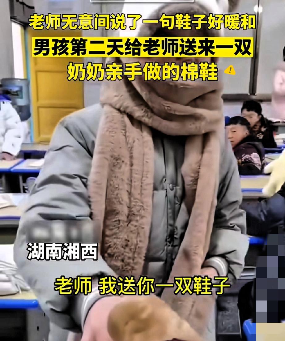 湘西一位女老师的随口一句话,竟被学生记在心里酿成满屏暖意。 食堂里瞥见学生脚上的手工棉鞋随口夸赞,转头第二天就收到孩子亲手递来的新鞋,这份猝不及防的温暖,让老师一整天都满是雀跃,像个被宠爱的孩子。 其实最打动人的从不是鞋子多好看,而是孩子藏在细节里的真心,更是师生间双向奔赴的温柔。 孩子愿意把奶奶的手艺分享给老师,根源是老师平日里的用心付出攒下的信任,这份纯粹的师生情,比冬日暖阳更暖人。 好的教育从来都是相互的,老师用真心待学生,学生便会用感恩回应,这份不带功利的纯粹联结,才是校园里最珍贵的光。 说到底,不是孩子太懂事,是良师遇童真,才撞出了这般治愈的温柔。 你们有没有收到过学生或晚辈突如其来的暖心礼物? 那份感动是不是至今都记得?评论区说说你的温暖瞬间吧~