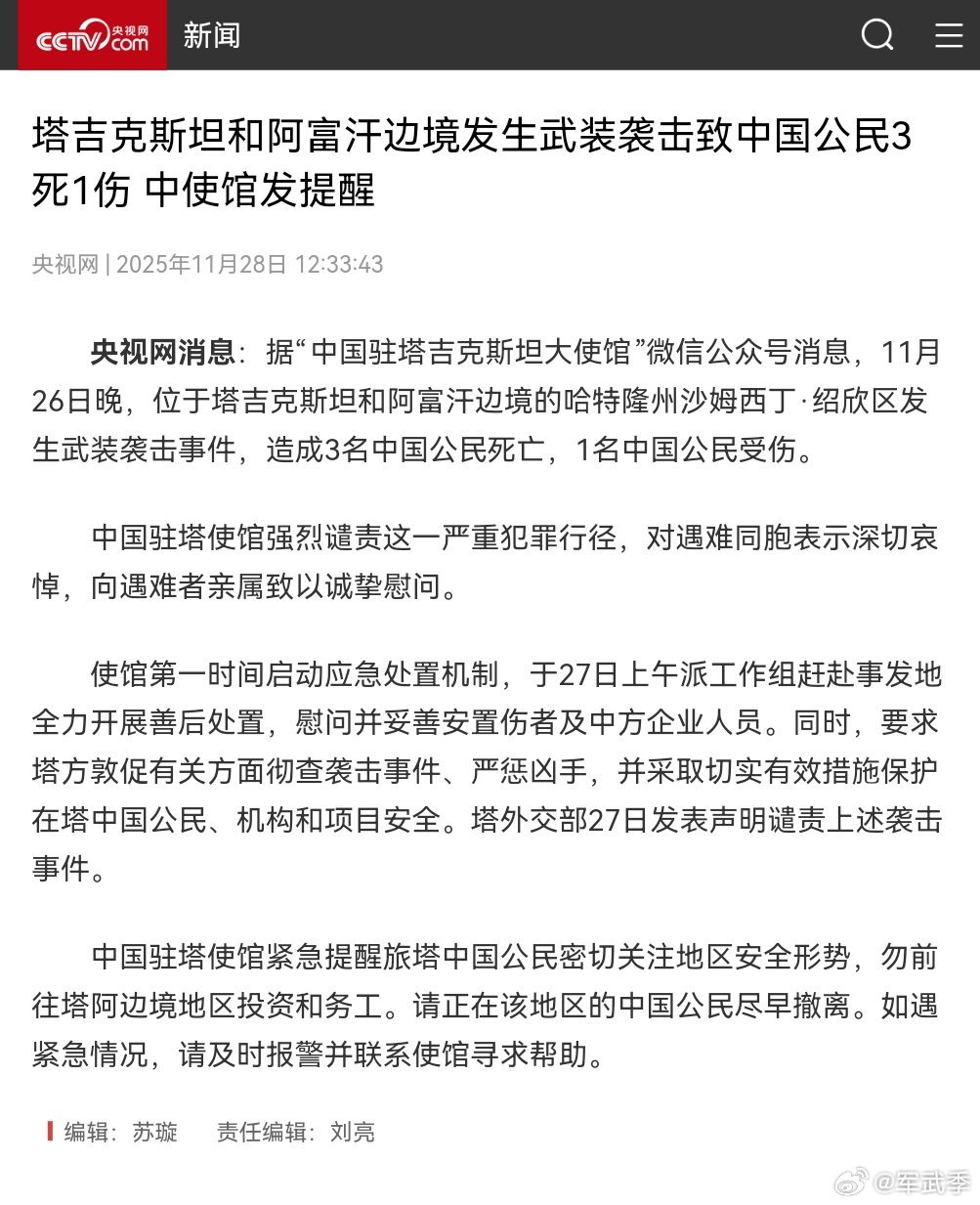 塔吉克斯坦和阿富汗边境一地区发生武装袭击事件,造成3名中国公民死亡,1名中国公民受伤。 中国驻塔使馆:强烈谴责这一严重犯罪行径,对遇难同胞表示深切哀悼。