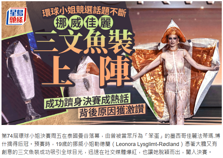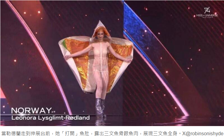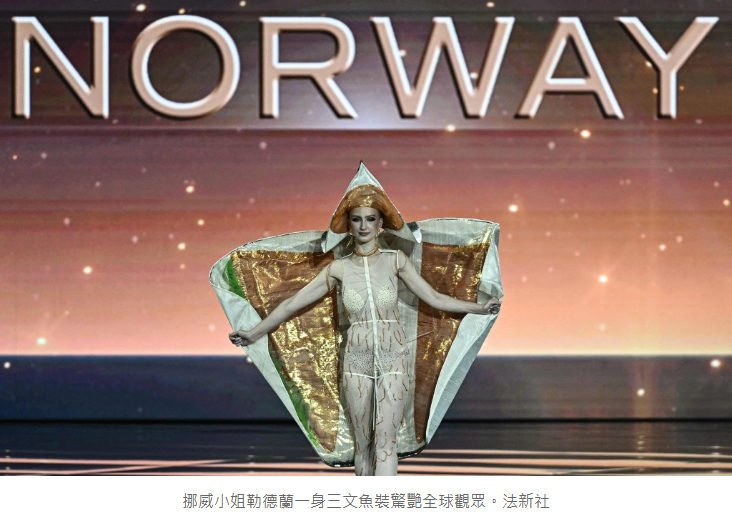 【挪威环球小姐扮三文鱼走红】第74届环球小姐决赛近日在泰国曼谷落幕,墨西哥佳丽法蒂玛.博什摘得后冠。预赛时,19岁的挪威小姐勒德兰(Leonora Lysglimt-Rødland)凭着大胆又有创意的三文鱼装成功吸引全球目光,迅速在社交媒体爆红,也让她脱颖而出,闯入决赛。勒德兰的三文鱼装以银色和粉红色为主色调,带有鱼鳞、鱼鳍及模拟三文鱼头部结构的服装,是为了致敬挪威的海洋文化。挪威是全球最大的三文鱼出口国之一,这套服装象征着该国在经济上的自豪与深厚的渔业传统。(星岛头条)