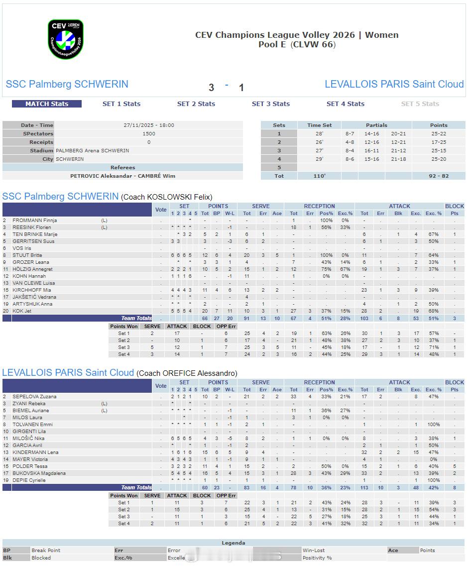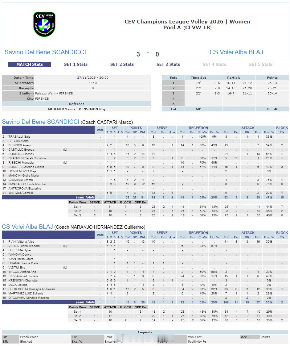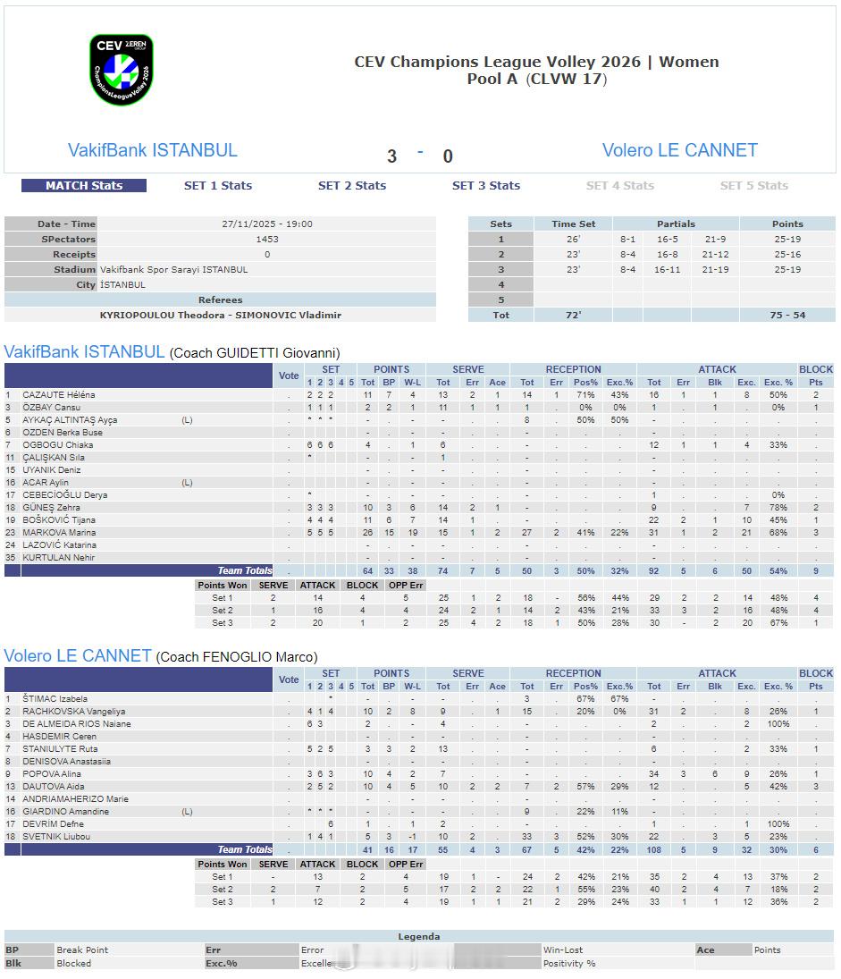 【欧冠女排瓦基弗轻取勒卡内斯坎迪奇完胜布拉日】国际排坛战报速递11月27日,