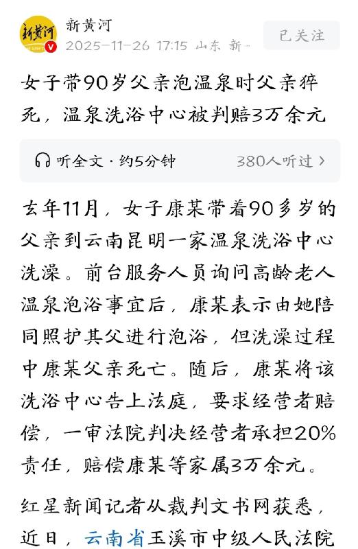 云南昆明,女子带90多岁的父亲到温泉洗浴中心泡澡,买票前,女子明确表示,她会全程陪同并照顾父亲。谁知,进去没多久,老人就出意外,尽管工作人员第一时间拨打了急救电话,但老人还是不幸去世。女子认为,父亲的悲剧洗浴中心应该负责,便将店家告上法庭,要求赔偿。洗浴中心觉得很冤枉,但法院的判决让人意外。 2024年11月云南昆明一家温泉洗浴中心,康女士为了让自己90多岁的父亲放松放松,带着老人去泡温泉。 买票的时候,前台特地问了一句:老人岁数大,泡澡可以吗?康女士很坚定地说:“我会全程陪着照顾。” 听起来,这安排挺妥当。可没想到,泡澡没多久,老人突然出了意外。工作人员第一时间打了急救电话,可惜还是没能挽回老人的生命。老父亲就这样,永远地离开了人世。 康女士悲痛欲绝,觉得洗浴中心有责任,直接把店家告上了法庭。店家却觉得特别冤枉:我们问过了,你自己说能照顾好,怎么出了事还得赖我们? 案件进了法院,结果让不少人都大吃一惊。一审法院判决,洗浴中心要承担两成责任,赔偿家属至少三万元。 洗浴中心自然不服判决,再度上诉。但近期公布的二审结果,却显示维持原判,店家上诉被驳回。 很多网友看了判决后,纷纷吐槽:“这锅背得冤!”“以后高龄老人都不能进洗浴中心了?”“做生意的太难了!” 但也有人说,洗浴中心毕竟是特殊场所,安全措施就得更到位,不能光靠一句“家属陪同”就万事大吉。 法院认为,洗浴中心作为公共服务场所,面对高龄老人这种特殊群体,有义务进行更加细致的风险提示和安全管理。 不能光靠一句“你自己照看好”就完事,该提醒还得提醒,该防护还得防护。老人泡温泉本身就有一定风险。90多岁的身体,被热水一冲,很容易引发突发疾病。 洗浴中心如果只靠家属自觉,出了事就一推了之,确实说不过去。站在法院角度,哪怕老人家属已经声明愿意全程照看,作为经营者,还是有防范义务。 当然,法院也没一股脑把责任全推给店家。判决书里说得很明白,家属也有照顾不周的责任。所以,最后判了20%的责任比例。 其实这件事,最让人唏嘘的还是康女士的孝心。90多岁的老人,能带去泡温泉,肯定是想让父亲晚年日子舒舒服服。可世事难料,意外说来就来。这样的悲剧,谁都不想遇到。 但反过来看,泡温泉确实对高龄老人有风险。热水会扩张血管,容易让有心脑血管隐患的老人突然出状况。 很多人觉得,老人精神头不错、身体硬朗,就能泡澡,其实稍有不慎就会出事。特别是90多岁这种高龄,哪怕看着没病,身体的“底子”其实已经很脆弱。 康女士当初说自己能照顾好父亲,恐怕也是出于对老人的了解和自信。可事实证明,风险有时候真的防不胜防。孝心是好事,但安全意识也不能丢。 不少网友看到判决后,最直接的反应就是“生意太难做了”。现在消费者越来越讲究服务,出了事,店家几乎都得担点责任。 站在洗浴中心的角度,这锅确实有点难背。明明问过家属,还特意提醒了风险,怎么还得担责?其实,这就是公共服务行业的无奈。 只要你开门做生意,法律就要求你承担一定的安全保障义务。你开的是温泉,不是家里的浴缸。只要有人出事,哪怕家属签了字,店家也不能一推了之。 这其实是社会发展带来的新问题。过去大家遇到意外习惯自认倒霉,现在法律越来越保护消费者,店家防不胜防。你多一份提醒,少一份麻烦。 但只要有风险,责任就不可能完全推干净。这事也给所有洗浴、旅游、娱乐等行业提了个醒。啥叫“风险告知”到位? 不是说嘴上说一句“泡温泉有风险”,让家属签个字就能高枕无忧。你还得考虑实际情况,比如老人能不能泡,泡多久合适,温度该怎么调。 法院这次判决,最核心的出发点其实很简单:生命安全第一。作为服务场所,你能挣钱,就得尽到相应的义务。不能靠一句“你自己看着办”,把所有风险都推给顾客。 但法律也不会让店家背全部锅。家属自己明知风险还坚持泡澡,出了事也要承担相应责任。这种判决,既提醒了商家,也给了家属一个警示。 大家都要在风险和责任之间,找到一个平衡点。不是一味推卸,也不是一味苛责,而是共同守护每一个家庭的幸福。 云南昆明的这场温泉泡澡悲剧,其实是社会转型期的缩影。孝心可贵,但不能忽略安全。店家要多一份细心,家属要多一份谨慎,法律要多一份公正。 只有这样,才能让咱中国的每个家庭,都能既享受美好生活,也能守住安全底线。孝顺老人不是一句口号,安全陪伴才是真正的孝心。 做生意的再难,也不能忽略生命的分量。家属再有孝心,也要把安全放在第一位。判决再“让人意外”,也是社会进步的必经之路。 愿今后,悲剧少一点,孝心和安全能齐头并进。生活再难,也要守住那份最基本的温情和底线。 参考资料: 《女子带90岁父亲泡温泉时父亲猝死 温泉洗浴中心被判赔3万余元》——红星新闻