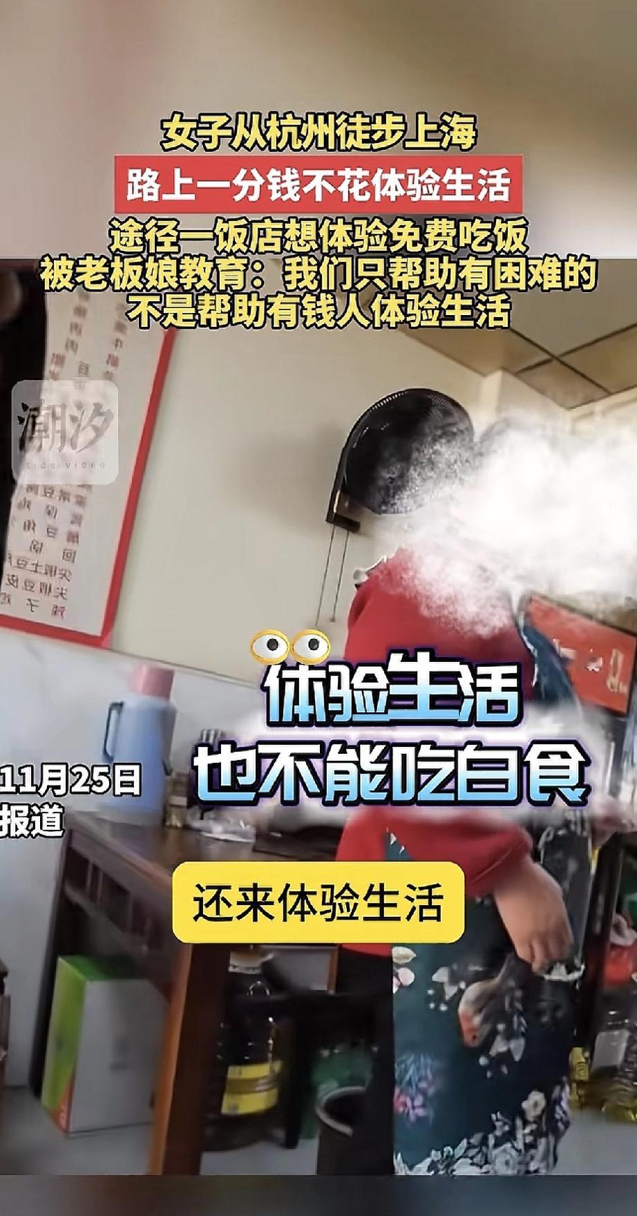 这位老板娘,话糙理不糙! 一个姑娘从杭州徒步到上海,想体验“身无分文”的生活。路过一家饭店时,她希望能享受“免费吃饭”的爱心服务,结果被老板娘一语点醒:“我们只帮助真正困难的人,不是帮有钱人体验生活。” 这份直爽让人忍不住叫好。社会的善意是留给雪中送炭的,不是用来锦上添花的。想体验生活是好事,但别占用真正需要帮助者的资源。 给明事理的老板娘点赞!爱心不该被消费,善良更需要被珍惜。
