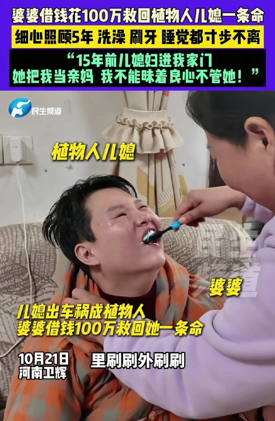 这简直就是亲妈啊! 河南新乡的清晨,天刚蒙蒙亮,张婆婆就轻手轻脚地从床上爬起来。厨房里的白粥在砂锅里“咕嘟咕嘟”冒着泡,她端着温热的粥碗走到儿媳床边,拿着小勺子一勺一勺往儿媳嘴里送。 这日子,一晃就是5年——从儿媳那场车祸把她撞成植物人那天起,张婆婆就没停下这样的照顾。 5年前的车祸,跟晴天霹雳似的,把家里搅了个天翻地覆。儿媳原本是个爱说爱笑的姑娘,结果躺在病床上毫无知觉。儿子急得头发白了一半,张婆婆却把牙一咬,东家借西家凑,硬生生凑了百万给儿媳治病。 有人在她耳边嘀咕“这就是个填不满的坑,算了吧”,她跟没听见似的,执意把儿媳接回了家。从那天起,她就成了儿媳的“专属护工”,学着给儿媳擦身、按摩,就连喂饭都得研究——把饭熬得烂烂的,一勺一勺耐心喂,每次喂完都能出一身汗。 夜里更折腾,儿媳但凡有点动静,张婆婆瞬间就醒,摸黑跑到床边看看是不是哪里不舒服。最让人暖心的是,她还记得儿媳爱美的性子,到处打听能给儿媳补头骨的医院,就想让儿媳以后醒来能体面些。 百万借款像座大山压着全家,可张婆婆从没喊过“头疼”,邻居看她天天忙得脚不沾地,问她“你图啥呀”,她就咧嘴笑笑:“那是我儿媳,我不管谁管?”就这么五年如一日,儿媳身上没长一处褥疮,气色也一天天好起来。 现在,张婆婆的故事传开了,不少好心人往家里送钱送护理用品。她捧着那些东西,眼睛闪着泪花说道:“咱不能白受人家的好,得把这份善意传下去。” 你说,这没有血缘却胜似血缘的亲情,是不是比金子还珍贵?当我们在生活里遇到点坎就唉声叹气时,看看张婆婆,就知道爱能扛住多少风雨。