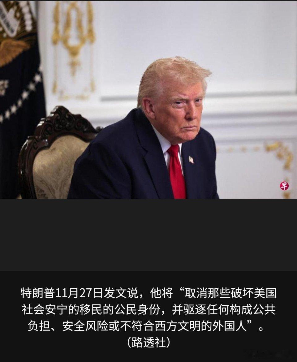寰球镜头非法移民 整治混入美国的非法移民,川普是认真的。现在的美利坚不收垃圾了,不知道大侄子会不会抱头痛哭?美国总统特朗普誓言,他的政府将致力于永久暂停所有“第三世界国家”的移民入境,以让美国体系得以全面恢复。路透社报道,特朗普星期四(11月27日)在社媒平台Truth Social发文说,他还将终止向“非公民”提供的所有联邦福利和补贴,“取消那些破坏美国社会安宁的移民的公民身份,并驱逐任何构成公共负担、安全风险或不符合西方文明的外国人”。海外新鲜事