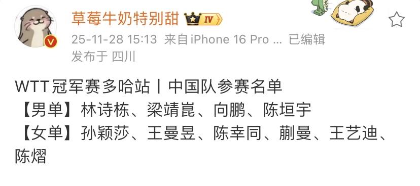 多哈冠军赛孙颖莎参加,王楚钦不参赛。 2026年1月7日开始的多哈冠军赛, 中国队的参赛名单已经出来了, 王楚钦确实不参加。 男队是石头,甜甜,向鹏和陈垣宇, 女队还是按照世界排名来的,孙颖莎到陈熠。 王楚钦结束乒超之后,就进入休息和调整的时间, 他也确实需要休整了, 连轴转的比赛,一直是强撑着坚持到最后一场。 孙颖莎坚持参赛的原因,暂时不清楚原因, 其实她也可以休息一下的。