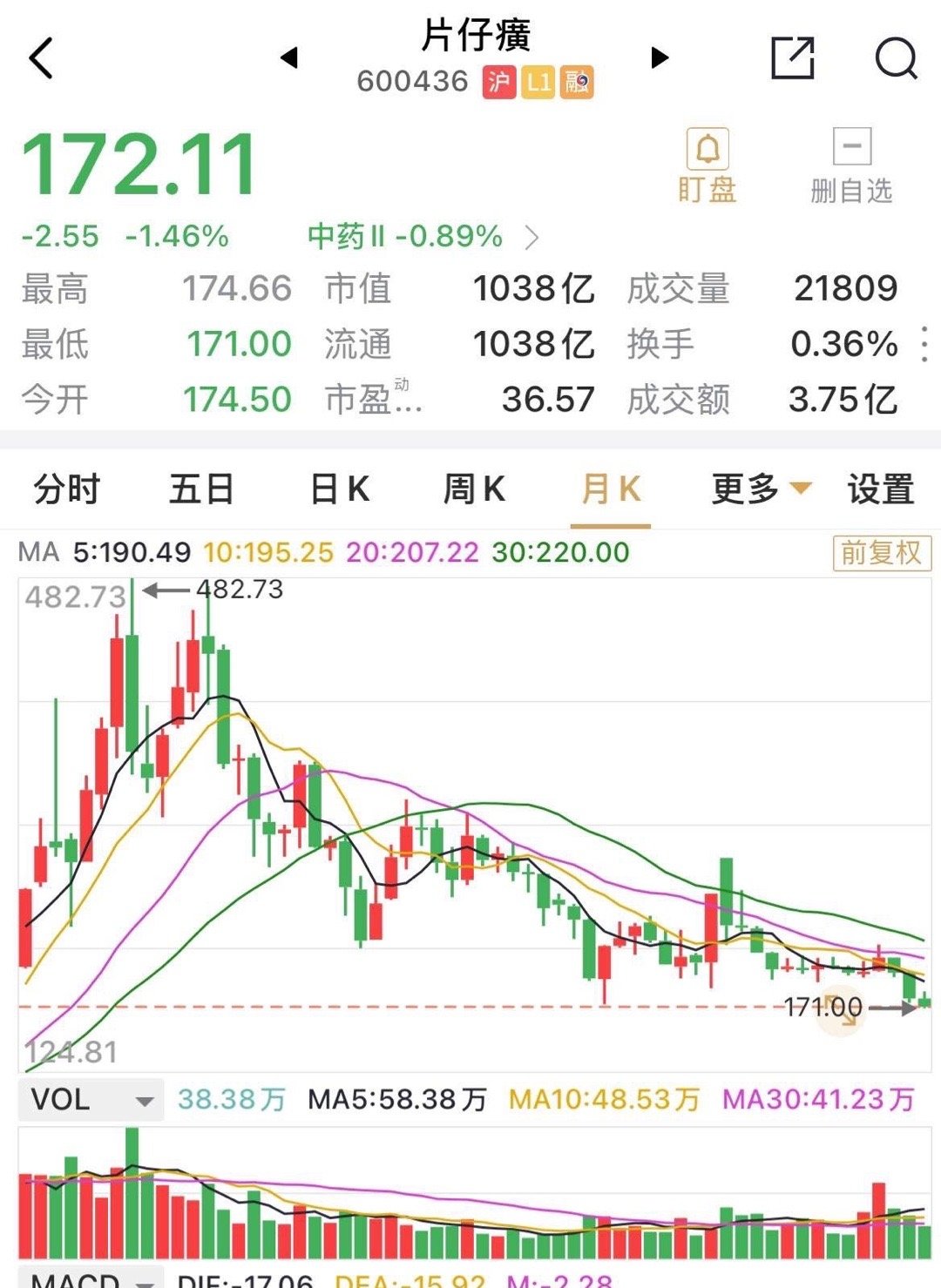片仔癀竟然比2024年10月的那轮高点279元,股价跌去百余元,算了算差不多回调了40%,而动态市盈率则仍然保持在36倍以上的高位。而以482元的历史高位来算,目前仅余1/3价格,也就是说彼时总市值在3000亿元左右,而其净利润却从来未达到30亿元,超百倍以上的市盈率。这估计就是A股市场呈现出的不成熟态势的集中体现,靠讲故事来推动股价。