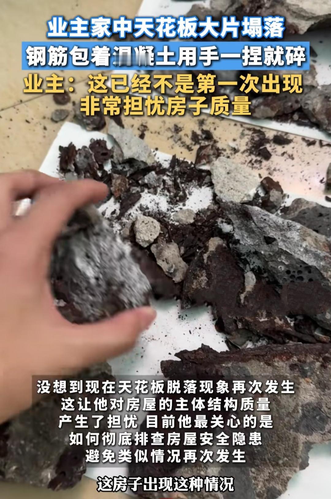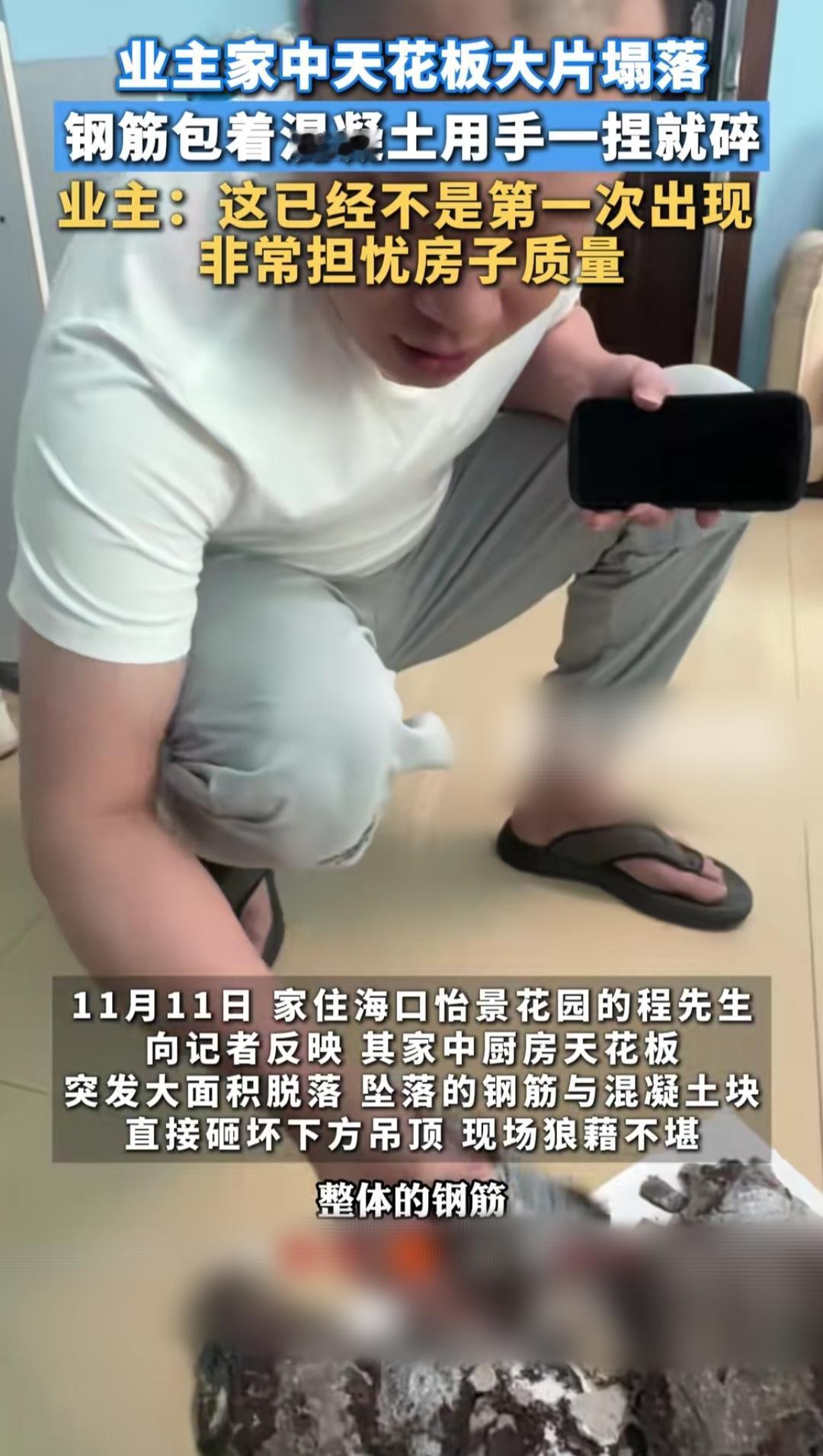 谁能想到,花半辈子积蓄买的房,天花板会突然塌下来?更吓人的是,掉下来的混凝土块裹着钢筋,用手一捏就碎成粉,这质量让人脊背发凉。 海口程先生家的厨房,近日遭遇天花板大片塌落,吊顶被砸得稀烂,裸露的钢筋看着就心惊。更让人揪心的是,这不是第一次出现脱落问题,之前就有过隐患,如今彻底爆发。 住了几年的房子,本该是遮风挡雨的港湾,却成了提心吊胆的“危楼”。业主每天在家都怕天花板再掉下来,连厨房都不敢轻易进——买房时盼着安居乐业,没成想踩了质量大坑。 房子是民生大事,每一块砖、每一抹水泥都该藏着责任。希望相关部门赶紧彻查,给业主一个安全的居住环境,也让更多人买房能放心。你家小区有过类似质量问题吗?