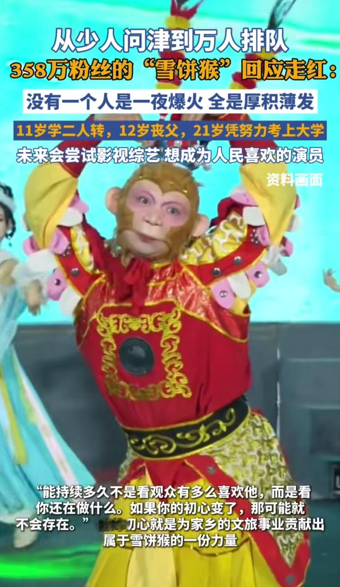 谁能想到,一个景区NPC能火到让游客排队3小时合影?刷到“雪饼猴”的视频时,我突然懂了:所有看似偶然的爆火,全是熬出来的必然。 他不是突然开窍的“幸运儿”,而是在没人关注的角落,对着空荡荡的游客通道练表情、抠动作,整整378天。没有流量加持,没有团队包装,就连服装都是自己缝补的,可他从没敷衍过任何一次互动。 游客要合影,他哪怕累到直不起腰,也会立刻切换状态;小朋友害怕,他会蹲下来慢慢引导。走红后他说“没有一夜爆火,只有厚积薄发”,这句话戳中了多少默默努力的人? 我们总羡慕别人的高光时刻,却忘了他们在黑暗里的坚持。那些看似不起眼的日复一日,终会在某天让你闪闪发光。你有没有为一件事坚持很久,最终迎来转机的经历?