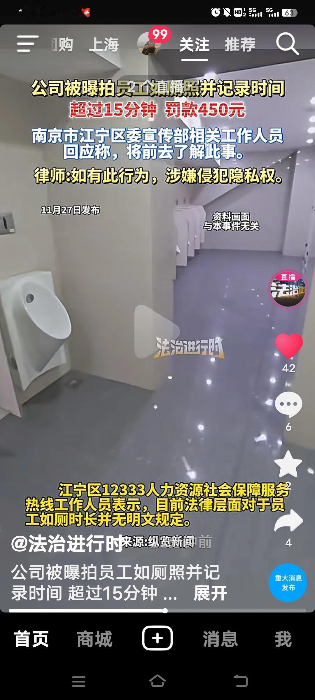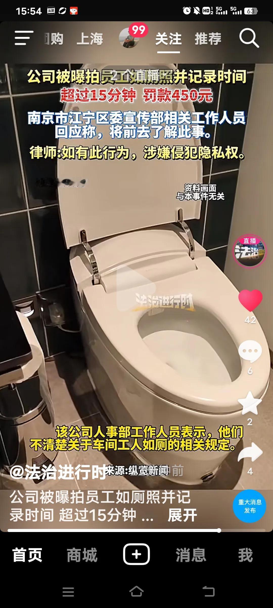 江苏南京有一家公司,那管理规定简直是“管天管地管拉屎放屁”。有网友爆料,自己曾是该公司的车间工人,公司规定员工如厕超过15分钟或者多次如厕,都要罚款450元。 而“多次”的界定全凭领导个人心情。公司还在厕所门口安装了监控,并且安排专人拍照记录员工如厕时间,聊天记录里的如厕照片都未打码。 工人们为了避免被罚款,即便拉肚子也得强忍着,实在是太可怜了。不过当地宣传部相关工作人员回应,会去了解此事,目前正在核查。律师表示,若情况属实,企业涉嫌侵犯员工隐私权。这家公司究竟怎么回事,就等调查结果揭晓了。 确实存在上班时间去厕所看手机的员工,但并非所有人都如此。这样的规定让遵守规矩的员工也受到了连累,毕竟上厕所是人之必须,总不能把大小便拉在裤子里。 员工要自觉遵守规定,领导也不能好坏不分“一刀切”。对于个别一去厕所就是个把小时的员工,确实应该进行处罚,大家说是不是这个道理? 企业处罚员工 公司卫生间 企业管太宽 南京员工