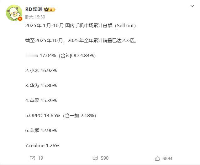 谁能想到,今年卖的最好的手机厂商居然是vivo?? 看这博主的爆料,1-10月的手机市场,居然是vivo份额最高,小米都排第二,华为第三,苹果都才第四,太夸张了,vivo这不声不响的,一直在发力啊