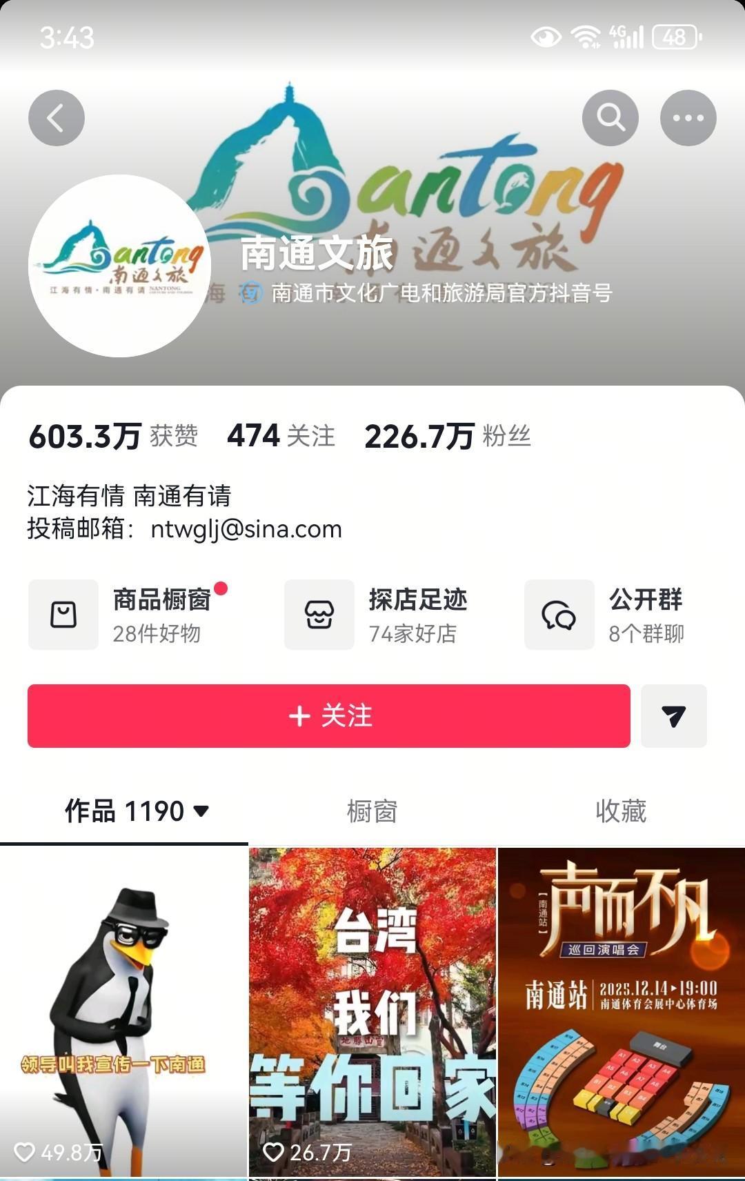 这粉涨的速度比坐火箭还快呐,以后选省会,我支持南通,大家应该没意见吧!南通有志之士现在要做的就是保住南通文旅小编的饭碗,因为有网友说运营小编“自愿离岗”了,但愿只是猜测,不是事实。 目前南通文旅粉丝高达226万,昨天将近35万粉丝,以这个速度轻松涨到500万不成问题。而且这粉丝含量不含任何水分,不是机器人,都是实打实心里佩服的活跃用户。正常来讲,官方不会这样评论,如果是忘记切号了,用官方号评论的小编可能会被问话,然后换人运营。 如今看来,换谁都不重要了,重要的是南通文旅敢为人先,已经把话说在前头了,要不要封存,网友们的态度已经清晰明了了。