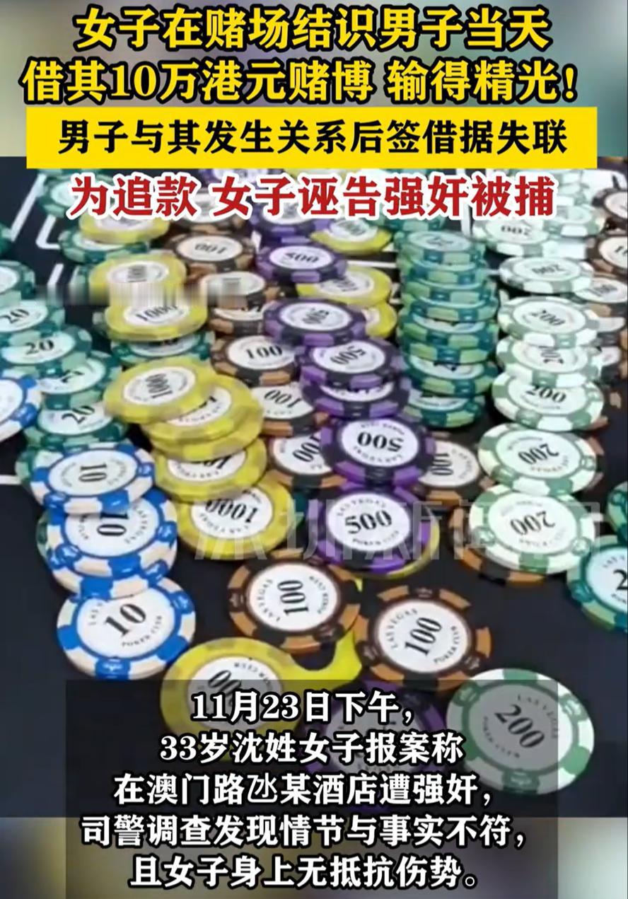离谱!澳门,一位三十多岁的女子,在赌场输了不少钱,心里急得发慌,想着能不能把钱追回来,然后认识了一位男子“代打”,可对方不但没把钱赢回来,还和她发生关系后失恋,女子报警说自己被强奸,结果自己却先被捕了 据报道,女子在赌场认识了一个男人,对方教她下注,结果先输掉四万。她心里不服气,就把自己的十万筹码借给男人继续赌,想靠他翻回来,还说好了如果赚了,她分两万。结果十万又输光 钱没了,她急了,就和男人去酒店谈怎么还钱。两人在房间里发生了关系,男人写了张十三万的借据,然后转身就消失了。她意识到这个钱八成要不回,于是心一横,跑去报警,说自己遭了强迫 警方一查,不对劲,身上没伤,也没对上她说的过程,事情当场穿帮,最后被移送检察院 有网友表示:这下真是赔了夫人又折兵 说实话,女子从一开始的心态就不对,一旦钱没了就想找个出口。怕家里问,怕自己承受不了,就想用另外一件事把原本的亏盖过去。人到这种时候,什么念头都可能冒出来,可越想走捷径越容易越走越偏。赌场里最难输的不是钱,而是判断力。输红了眼,人容易觉得世界欠自己一把,结果越折腾,风险越大 欠钱是欠钱,纠纷是纠纷,把它们搅在一起,事情就会完全失控。想追回损失靠的是证据和正规途径,不是把责任甩给别人。任何地方的执法都很清楚,事实查不通,后果只会落在自己身上 成年人在外走动,最重要的是守住底线,心急的时候不要做让自己更被动的事。赌博本身就带着风险,一旦踩进去要么及时止损,要么认账,不要幻想有人能带你翻盘。钱可以慢慢挣,冲动的代价才是真正让人头疼的地方