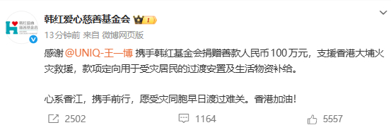 【王一博捐款100万元驰援香港】携手韩红基金会捐赠善款人民币100万元,支援香港大埔火灾救援,款项定向用于受灾居民的过渡安置及生活物资补给。