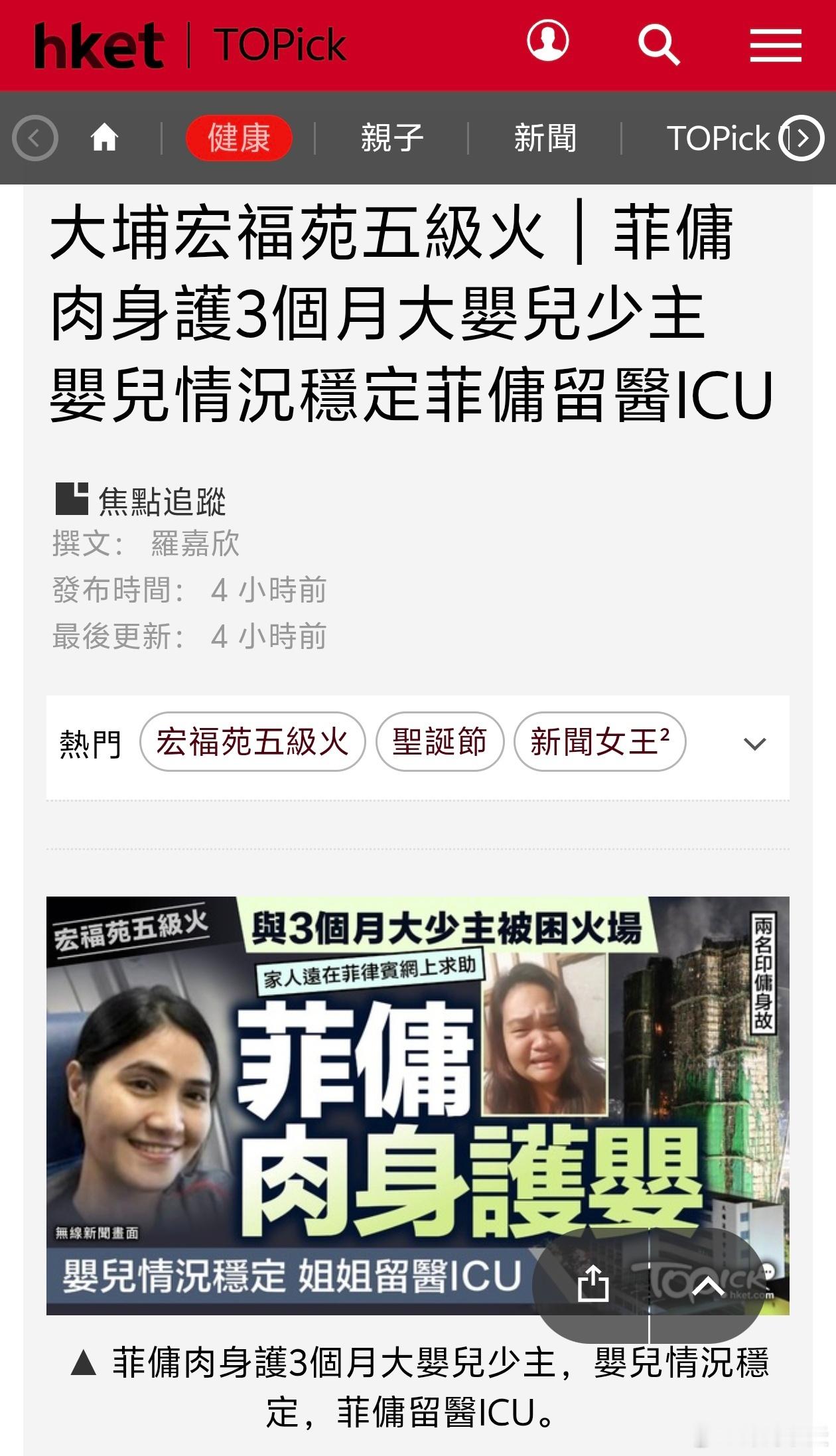 港媒:菲佣肉身护3个月大婴儿少主香港经济日报报道,在火警发生期间,有菲律宾人在网上发短片求助,表示自己的妹妹在宏福苑(着火大厦)当外佣,正与3个月大的少主被困火场。最终该名外佣及婴儿一同被消防员救出送院。被救出时,外佣抱著婴儿,婴儿目前情况稳定,外佣则在医院ICU留医。报道指,菲律宾驻港总领事馆表示,未收到有菲律宾人在火灾中伤亡。惟印尼驻港总领事馆则表示,有2名印佣死亡,另外2名印佣受伤。香港大火71岁阿伯现场寻家人香港火灾事件已有5人被拘