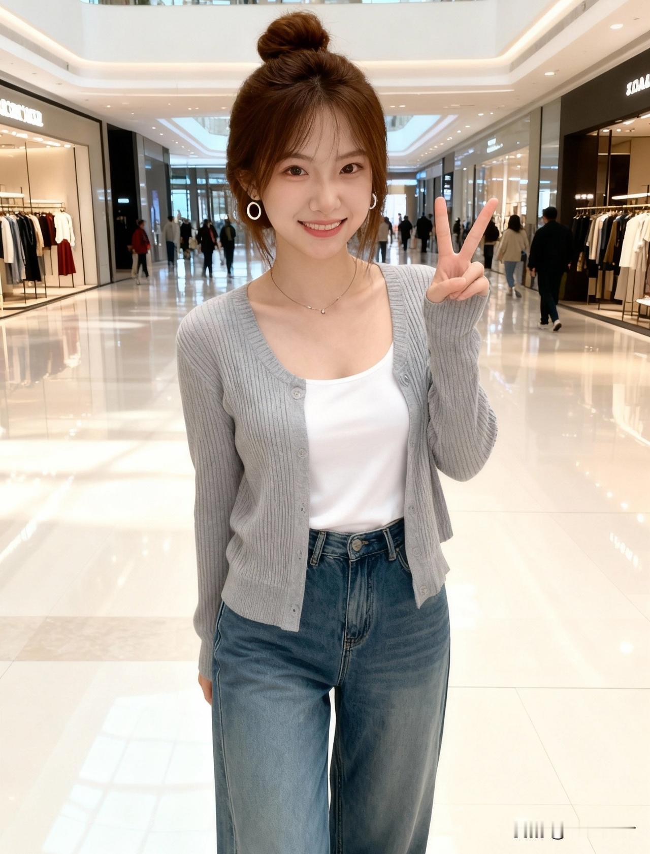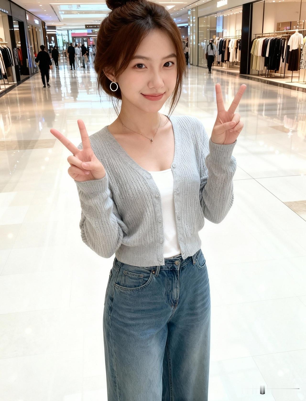 在商场里打卡,比个胜利手势,元气满满的一天!😊👍