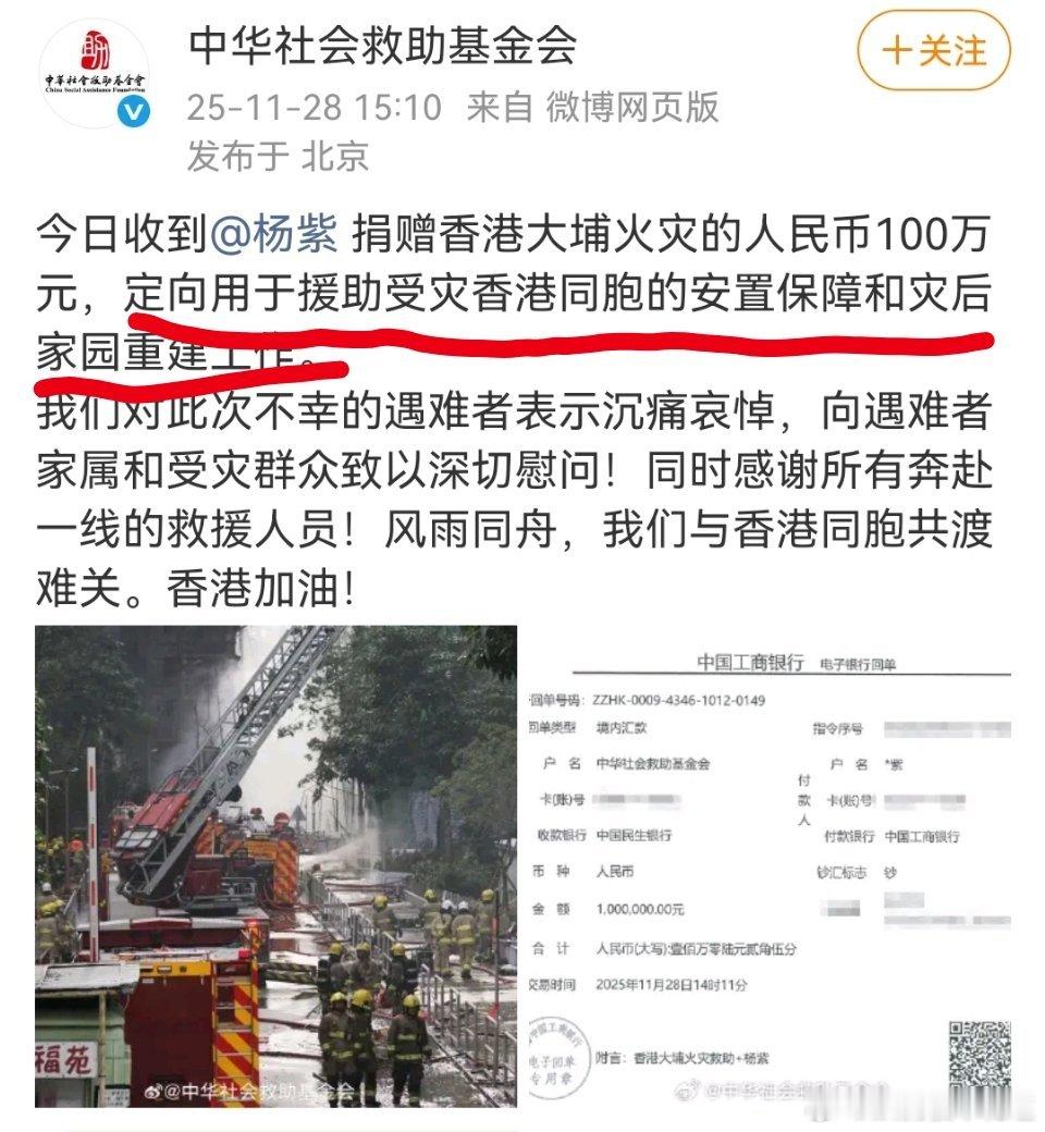 杨紫为香港捐款100万 杨紫为香港捐款100万元,定向用于援助受灾同胞的安置保障和灾后重建。希望这些钱能够切实用到受灾群众身上,但是该追责的还是得追责。杨紫为香港捐赠100万元