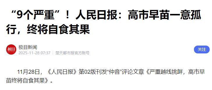 人民日报定调!高市早苗只有一个结局! 11 月 28 日,《人民日报》以 “仲音” 之名发文,直指日本首相高市早苗涉台言论的危险性,这番批评字字千钧,戳中了问题的要害。毕竟在台湾问题上玩火,从来没有好下场,高市早苗显然没搞懂这个基本道理。 台湾是中国的一部分,这不是口头说说的,从《开罗宣言》到联合国相关决议,白纸黑字写得明明白白,这是国际社会公认的事实。 可高市早苗偏要在国会这种正式场合跳出来,暗示要武力介入台海,这是二战后日本领导人头一回敢这么明目张胆地放话。主权是国家的根,中国在台湾问题上没有任何让步空间,这种直接挑衅主权的行为,不被狠批才怪。 更让人不能接受的是,这完全是干涉中国内政。台湾事务是中国人自己的事,该怎么实现统一,轮不到外人指手画脚。 高市早苗这话一放,无疑是给 “台独” 势力递刀子,传递了极其错误的信号。要知道中日建交以来的四个政治文件都明确了一个中国原则,她这么做,根本就是把这些共识当空气。 尤其在今年这个特殊节点,这种言论更显刺眼。今年是抗战胜利 80 周年,也是台湾光复 80 周年,日本当年对台湾 50 年的殖民统治,还有给中国和亚洲各国带来的战火苦难,都是刻在骨子里的痛。 台湾同胞 65 万多人牺牲在抗日战场上,这笔账不能忘。作为日本首相,本该带头反省历史,可高市早苗反而发表挑衅言论,这不是往受害国人民心上捅刀吗? 往深了看,她这番话背后藏着军事扩张的野心。把 “台湾有事” 和所谓 “集体自卫权” 绑在一起,说白了就是为扩军找借口。 上台以来,她在军事上动作不断,甚至想动 “无核三原则” 的主意,这路子和当年日本军国主义找借口发动战争何其相似?历史早就证明,靠武力扩张只会把自己拖进深渊,她这是在走危险的回头路。 这种做法连日本国内都不买账,不少有识之士公开批评,民众还去首相官邸前抗议,大家都明白这种挑衅只会给日本招祸。 作为战败国,日本的行为本该受和平宪法和国际法约束,可高市早苗带头想架空和平宪法,背弃 “专守防卫” 原则,这是在挑战战后国际秩序,必然会遭到全世界反对。 更可笑的是她的出尔反尔,之前还说要遵守中日联合声明的立场,转头就翻脸不认人。外交上如此反复无常,只会让日本在国际上丢信誉,变成没人信的 “孤家寡人”。 俄罗斯、泰国等国已经明确表示反对,因为大家都清楚,这种言论会搅乱地区和平。 从参拜靖国神社到否认历史,高市早苗的一系列操作,都是在践踏正义良知。忘记历史就会重蹈覆辙,日本要是任由右翼势力抬头,只会离繁荣越来越远。 《人民日报》的批评,既是警告也是提醒:台海不是日本的 “后花园”,挑衅中国主权和历史正义,终将自食恶果,这是铁律。