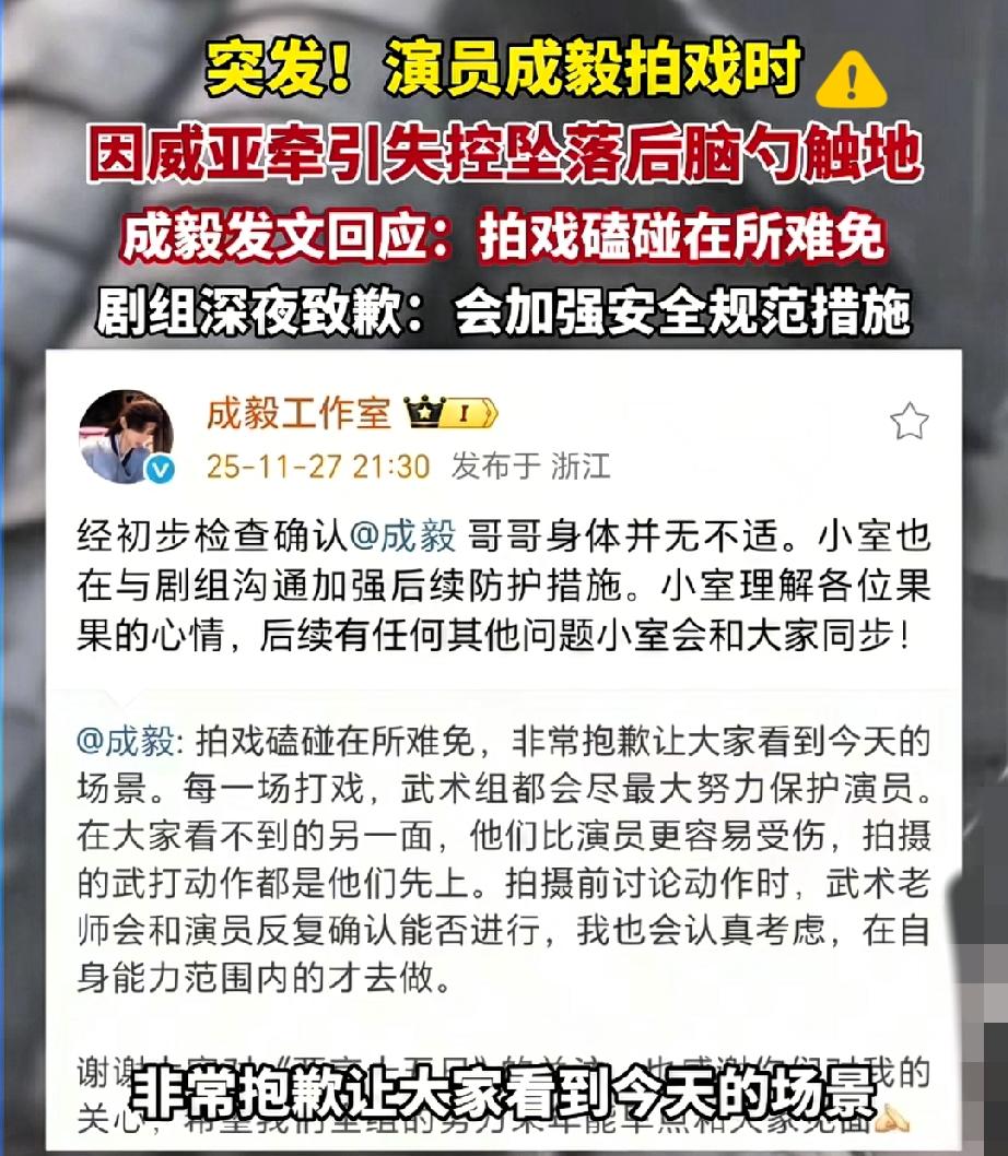 成毅拍戏意外的视频,看得人心脏揪着疼! 拍摄屋顶戏份时威亚失控,先撞了障碍物再重重摔落,后脑勺直接着地,当场蜷缩着抱头打滚,疼得根本起不来身,关键现场还没铺缓冲垫,想想都觉得后怕。 可让人动容的是,他深夜回应只轻描淡写说拍戏磕碰难免,还反过来替武术组说话,说他们比演员更易受伤,这份体谅和敬业真的难得。 剧组虽致歉承诺加强防护,但这次意外也该敲醒警钟:演员的敬业从不是剧组忽视安全的借口,哪怕是常规戏份,防护措施也容不得半点马虎,毕竟健康安全才是底线。 敬业值得尊重,可安全更该被优先保障,希望所有剧组都能真正把演职人员的安全放在心上,别让意外再发生。 你怎么看拍戏时的安全防护问题?评论区聊聊你的想法~