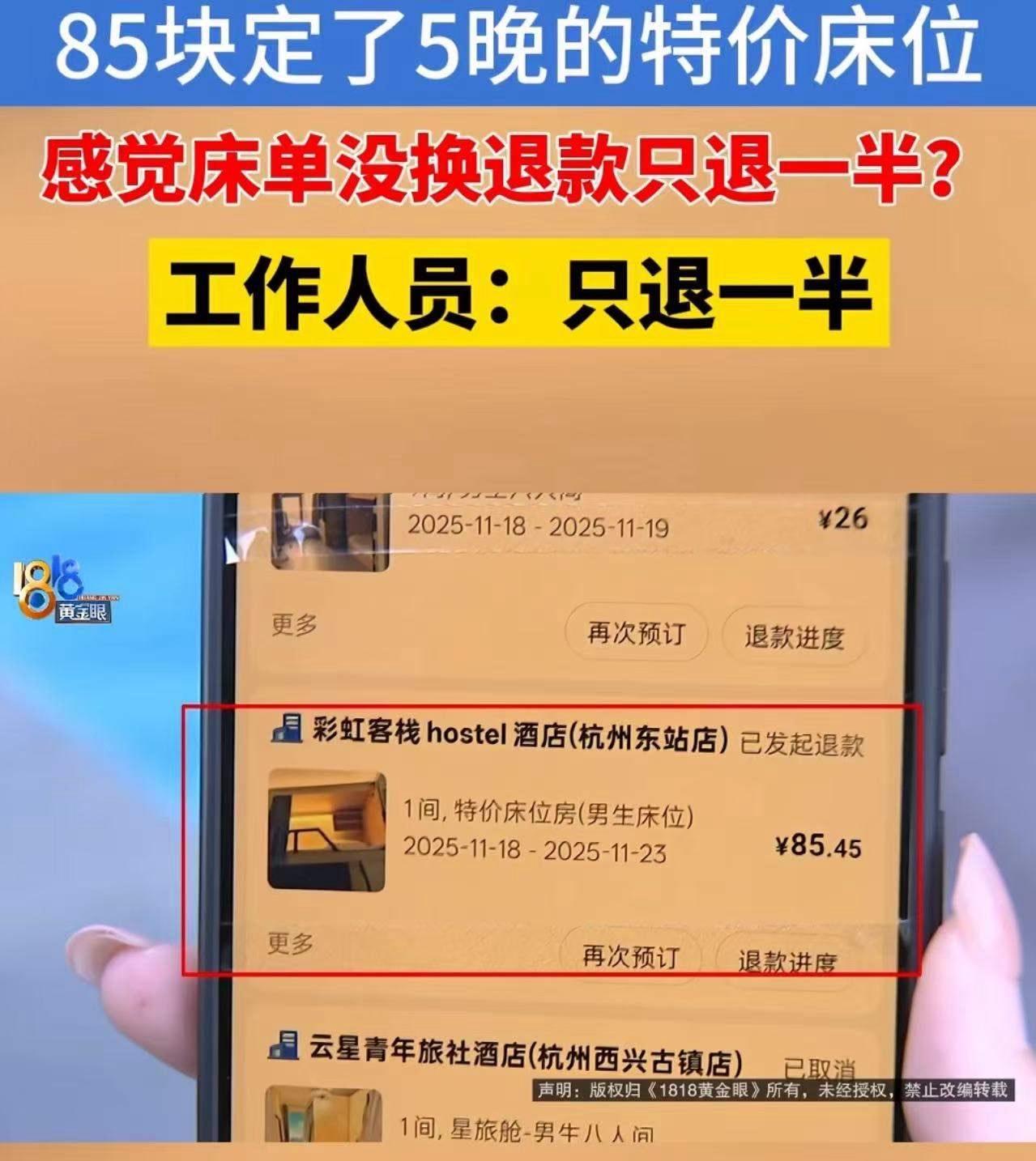 男子为了42块钱找到电视台,背后故事令人心酸! 在这个物欲横流、快节奏的时代,许多人都在为了生活的琐碎而奔波。浙江杭州的这位男子,用他微薄的积蓄,花了85块钱定了5晚的特价床位,本以为能在繁忙的都市中找到一丝安宁,却没想到迎来的是一场令人心碎的“权益之战”。 当他走进房间,第一眼看到的不是温馨的环境,而是那张没有换洗的床单。作为一个普通人,他的心里充满了失望和愤怒。毕竟,花了钱,理应得到干净、舒适的休息环境。这种“被欺骗”的感觉,无疑让他觉得自己的权益被践踏。于是,他毅然决定退房,想要维护自己的合法权益。 然而,商家的回应却令人心寒——只退他一半的钱!“我都没入住,凭什么只退我一半?”他的话语中满是委屈与不解。这不仅仅是一场简单的退费纠纷,更折射出一些商家在利益面前忽视了消费者的权益,忽视了一个普通人的尊严。 网友们的评论也异常热烈。有的人调侃:“在1818黄金眼上节目,不带墨镜不戴口罩,那就百分百有理有据!”这句话看似调侃,却也反映出公众对这种不公行为的愤怒和不满。我们常常看到,很多商家为了追求利益最大化,忽视了最基本的诚信和责任。而普通消费者,尤其是像这位男子这样,面对强大的商业压力,却常常无力反抗。 这件事让我们不得不深思:在这个时代,诚信与尊重变得尤为重要。每一个微小的权益都值得被尊重,每一个普通人都应该被公平对待。或许,这个男子的遭遇只是冰山一角,但它折射出的是整个社会对诚信的缺失和对弱势群体的忽视。 我们不能只停留在愤怒和吐槽上,更应该行动起来。呼吁相关部门加强监管,推动企业诚信经营,让每个人都能在生活中感受到公平与温暖。毕竟,社会的进步,正是建立在每一个普通人的尊重和权益之上。 这件事提醒我们:在追求生活品质的同时,更要坚持自己的权益不被侵犯。无论多微小的权益,都值得我们去争取。只有这样,我们的社会才能变得更加公平、温暖。让我们共同关注每一个像这位男子一样的普通人,让他们的声音被听见,让正义成为常态。因为,只有当每个人都被尊重,社会才会更加美好。