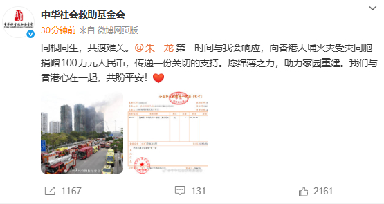 【朱一龙捐款100万驰援香港】同根同生,共渡难关。通过中华社会救助基金会向香港大埔火灾受灾同胞捐赠100万元人民币。愿绵薄之力,助力家园重建。我们与香港心在一起,共盼平安!