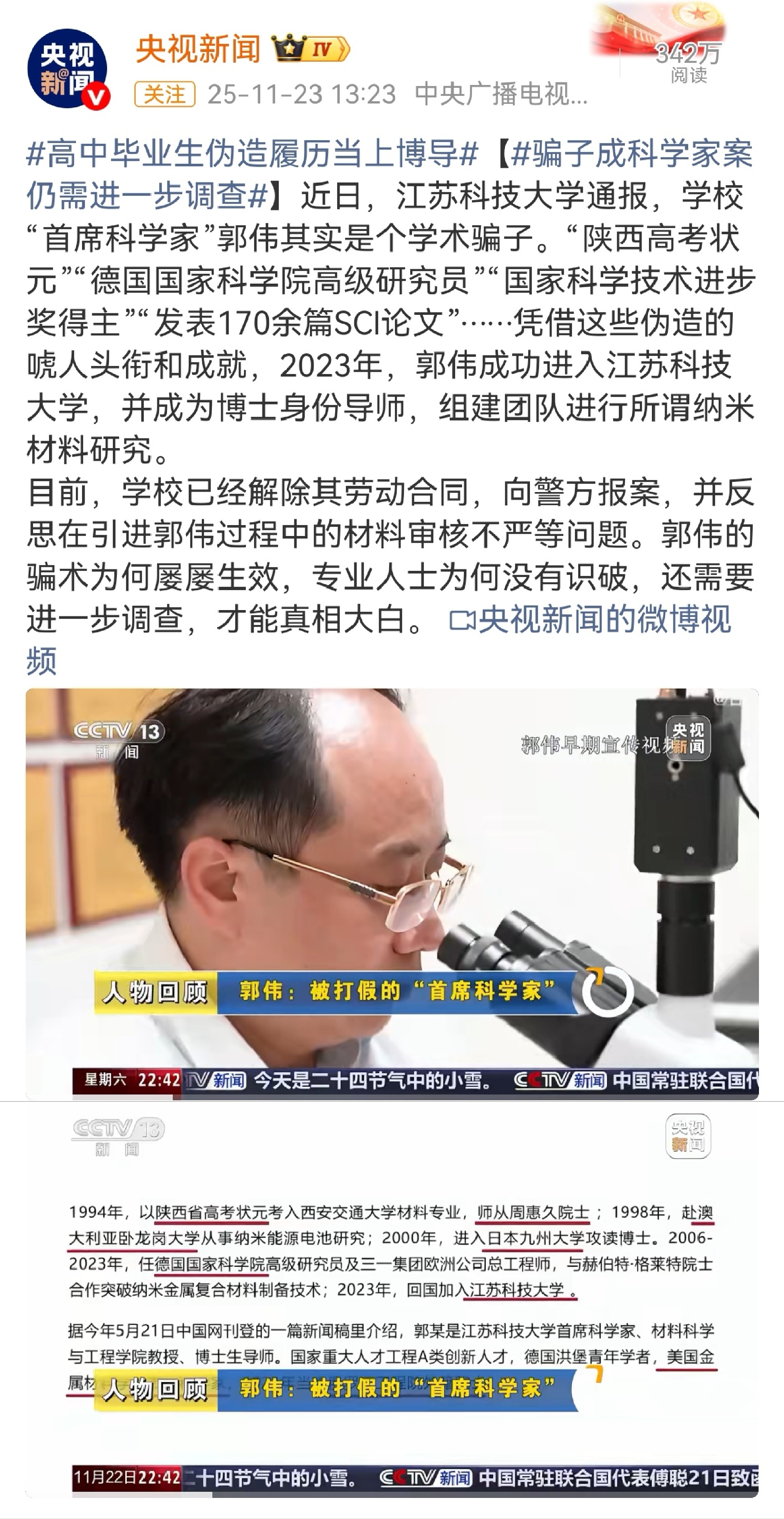 江苏科技大学的“首席科学家”、博士生导师郭伟,只有高中学历的学术骗子;湖北科技学院临床医学专业本科生丁家一,同样有各种学术、证书造假;知名考研辅导网红张雪峰,早年自称是清华大学或北京大学研究生,实则为本科肄业。世界是一个巨大的草台班子,出门在外身份都是自己给的,至于别人信不信那是别人的事儿,如果对方不信,可以换个人继续骗,谎话说多后自己也就信了。高校的高端人才引进,居然有如此严重的漏洞,很多公司的社会招聘过程中,又有多少是认真看学历真假的?只要对方够能掰扯,能被面试官认可,学历造假也能进某个公司,如果被识破,完全可以换个公司继续诓骗。说到底,学术造假的违法成本太低了。