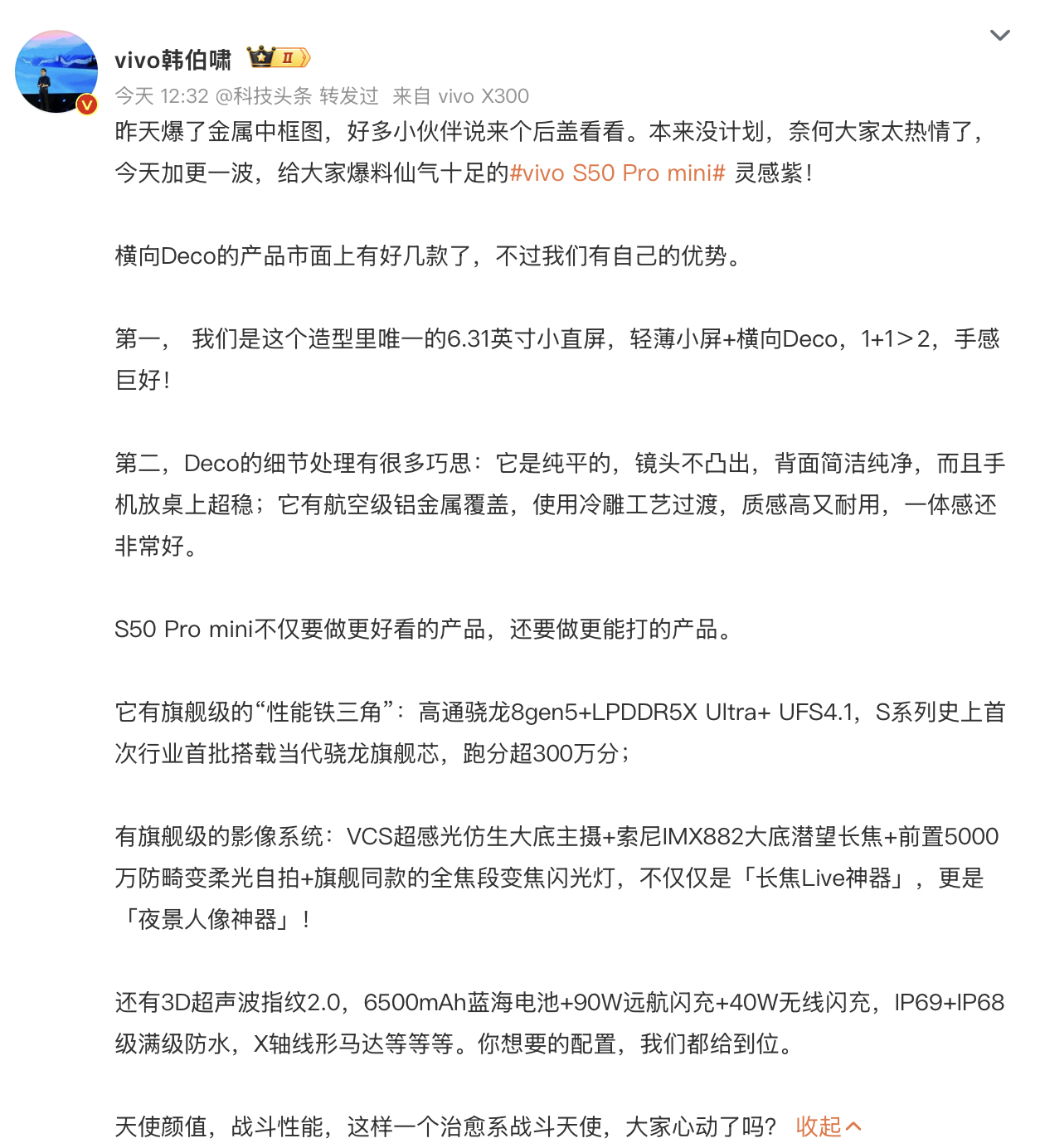 S50Promini战斗天使!6.31英寸黄金小屏,横置DECO 更好的握持手感,8Gen5+潜望长焦+超声波指纹+满级防水....价格3499?
