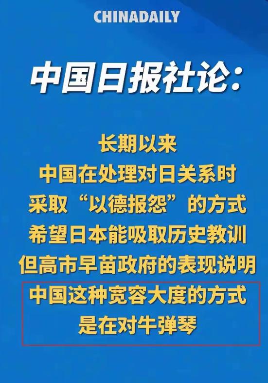 很欣慰:咱们终于“开窍”了! 中国日报社论:我们在处理中日关系时,经常采取“以德报怨”的方式。总是希望日本台吸取历史教训,但是高市早苗政府的表现说明,我的这种大度、是在对牛弹琴! 我们就是太善良,儒家思想太严重,咱们总是说,和为贵,可是对方想和为贵吗 对恶人仁慈就是助纣为虐,就好像人与人之间,好说活老实总是被欺负 过去是“豺狼来了🈶猎枪”,我们吃了大亏——差点被亡国灭种......我们要改为“端着猎枪出去打豺狼”了,让机器狗、机器狼、机器虎、机器豹、机器狮子“端着猎枪出去打豺狼”......