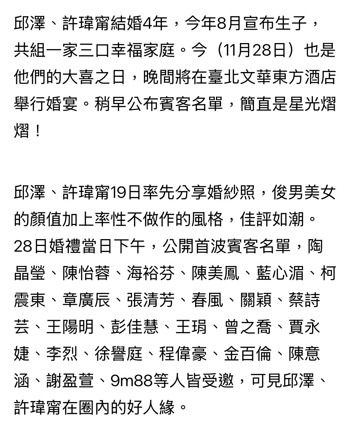 邱泽许玮甯婚礼宾客名单邱泽许玮甯今晚婚宴首波宾客名单!陶晶莹、陈怡蓉、海裕芬、