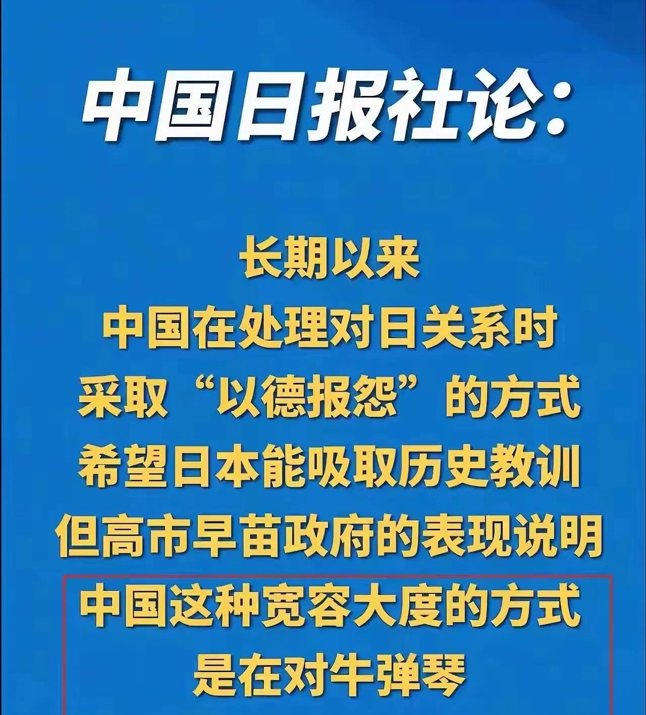 太提气!中方对日态度终“清醒”! 中国日报社论一语中的:长期以来,我们以“以德报怨”对待中日关系,满心期盼日本正视历史、吸取教训,可高市早苗政府的种种行径,彻底证明这份大度纯属对牛弹琴! 千万别只知“以德报怨”,却忘了后半句“何以报德?”老祖宗早留下“恩怨分明”的智慧——对好人和恶人一视同仁,不就是是非不分吗?更有古训警示“有仇不报非君子”! 用“以德报怨”试过了,对方非但不领情,反倒觉得我们软弱可欺!如今,是时候拿出“恩怨分明”“以直报怨”的态度对待日本了! 一味退让换不来尊重,平等相待、坚守底线才是大国相处的正道!中方调整对日态度,从不是要激化矛盾,而是捍卫国家尊严、正视历史记忆,这才是对民族和未来的负责! 日本对华态度