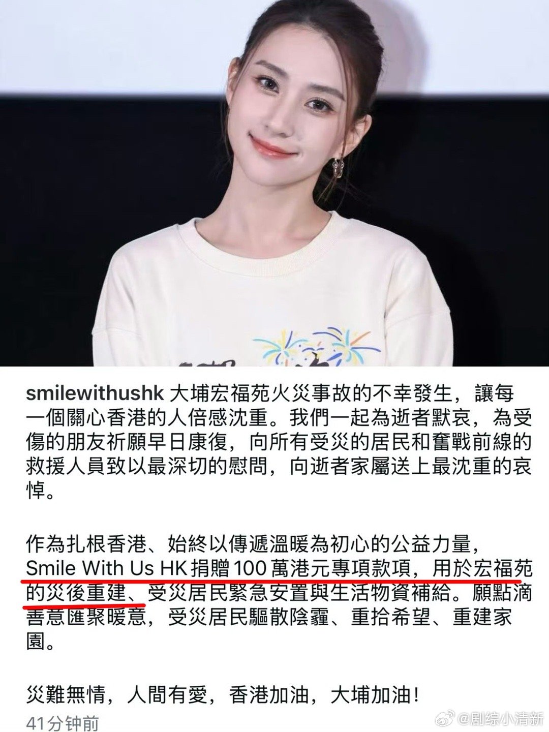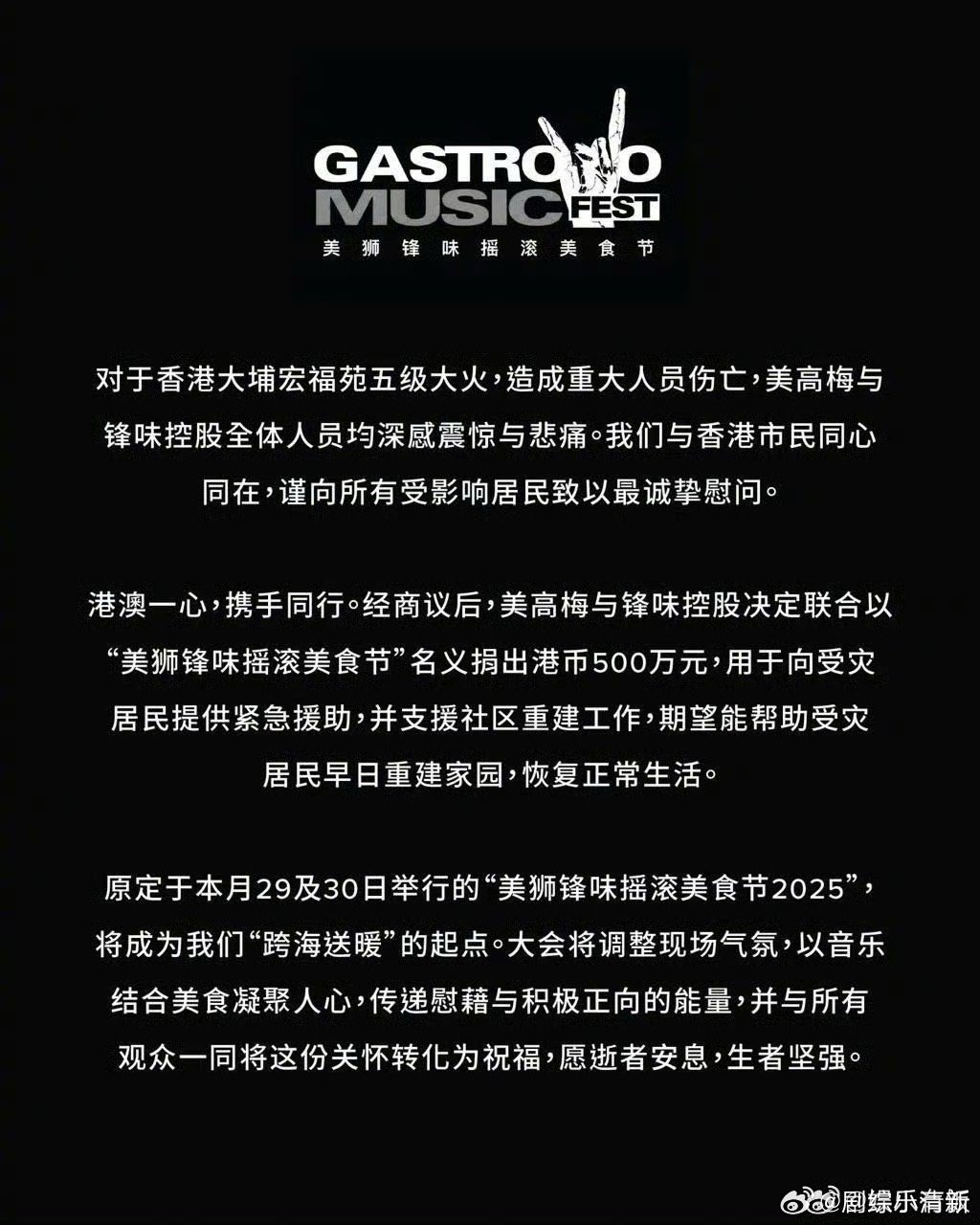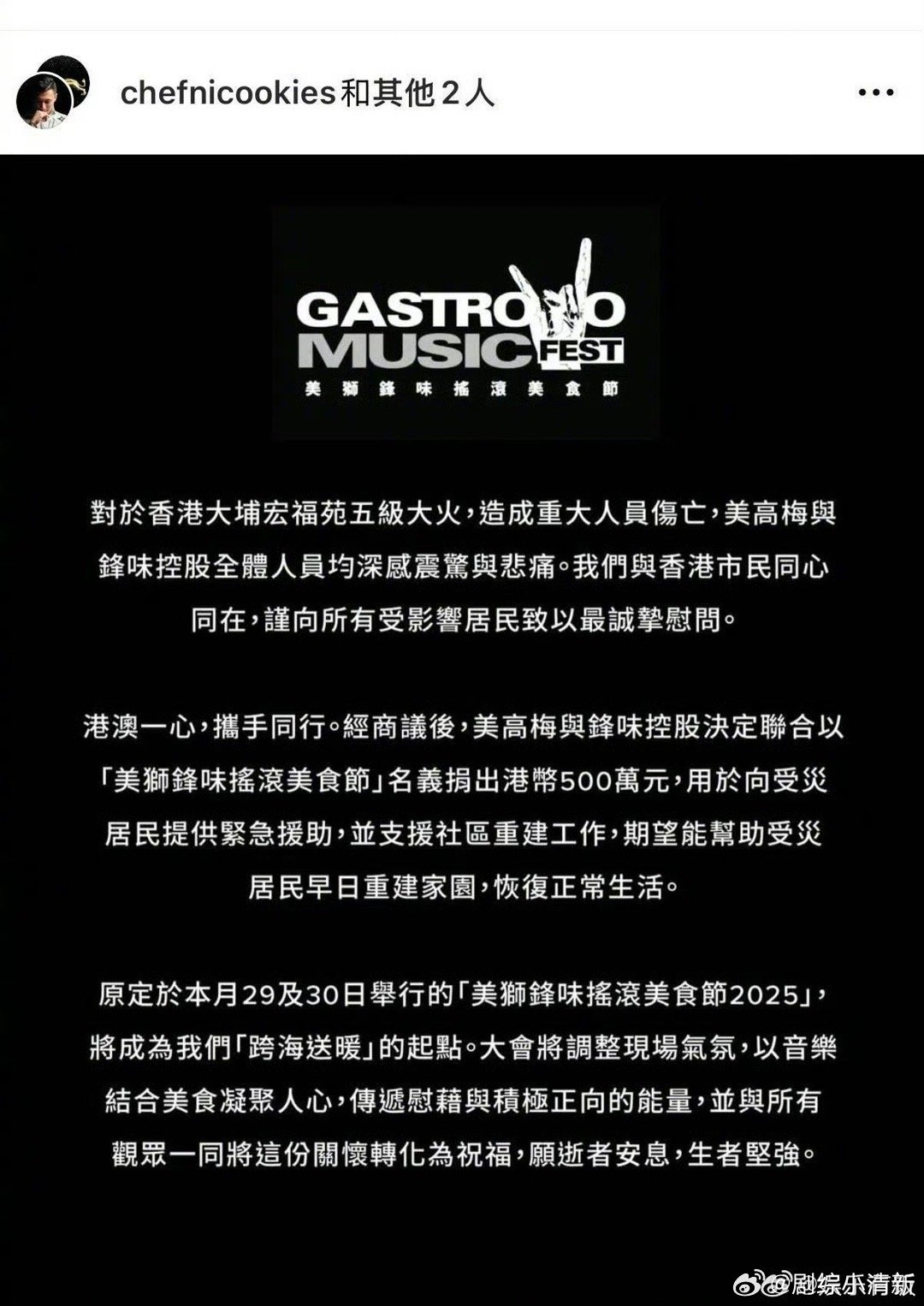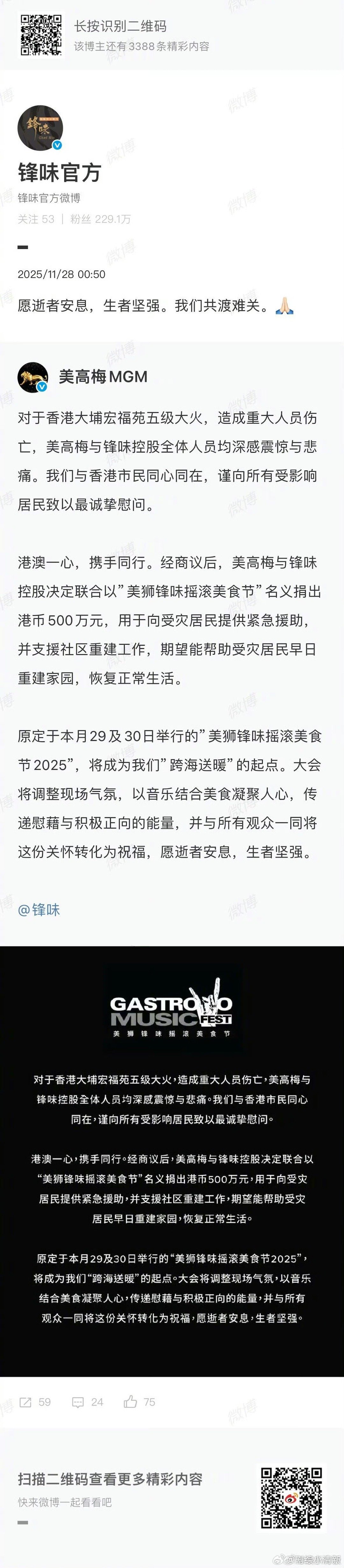 谢霆锋何超琼为香港火灾捐款500万 香港大埔火灾牵动人心,谢霆锋与何超琼以"锋味摇滚美食节"名义联合捐赠500万港币,用于紧急救援和社区重建。危难时刻见真情,这份迅速响应的善举为受灾同胞送去温暖与希望,愿香港早日渡过难关!