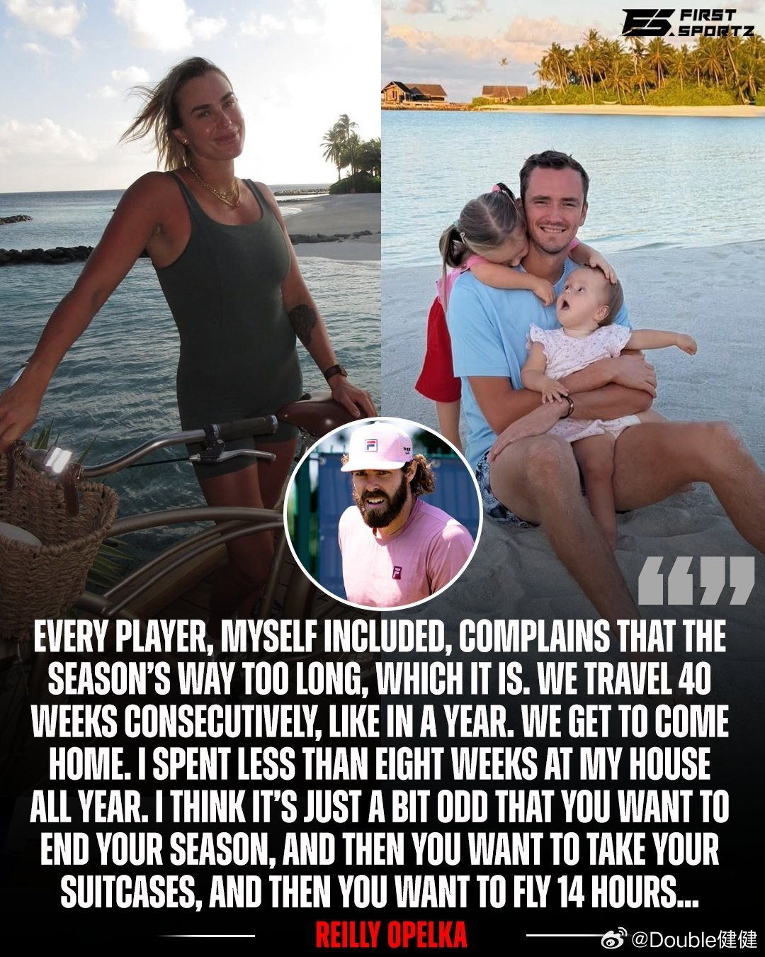 【原来网球选手都去马尔代夫度假有免费住宿!排名30到50的住希尔顿或喜来登】奎雷伊:对很多人来说住宿是免费的。每天打一小时网球,费用全包。简单交易:度假村负担住宿,选手付出打球时间。地点还是全球最梦幻的景点之一。前十选手去最昂贵的度假村。排名30到50的住希尔顿或喜来登。欧佩卡坚决拒绝:我宁可花2.5万美元待在家。我们一年有40周在旅行。整季我待在家不到八周。现在居然还要飞14小时……去和其他选手住同一间饭店?就算他们免费招待6天,每天只打一小时网球?我也会拒绝。我宁可花2.5万美元待在家。热点现场