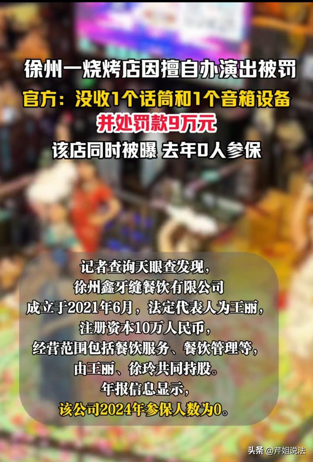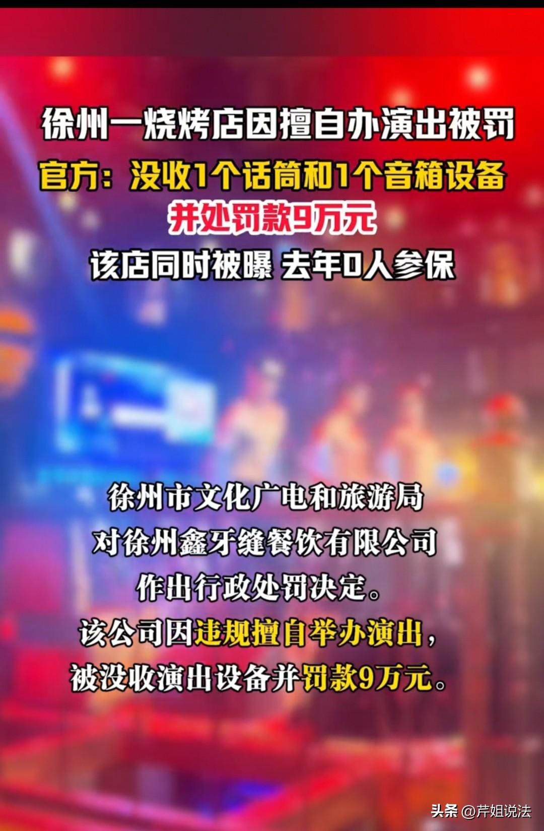 徐州,一烧烤店为了留住食客,擅自举办演出,结果被罚款9万元,就连用于演出的话筒和音箱也被没收了。店家对此不服,然而执法人员进一步核查发现,该店2024年年报显示参保人数为0,但店里明明有不少员工在工作。至此,执法人员才意识到,店家的违规行为并非只有非法演出这一项。 烧烤店的生意难做,内卷越来越厉害,徐州鑫牙缝餐饮有限公司的老板看着店里平平淡淡的客流,突发奇想:何不开“演出”呢?既能搞点新鲜感,又能吸引更多食客,说不定能盘活生意。 有了这个想法,他就立刻着手落实,在网上随便买了话筒、音箱,没做任何报备,也没多想是否合规,就在店里快速搭建了一个简易台子,热热闹闹地办起了演出——除了常见的歌手驻唱,还特意安排了“男模秀”“旗袍美女秀”等特色环节增添趣味性,不管是喜欢听歌的,还是想看热闹的,大大小小的食客都能找到兴趣点,总有一款适合自己。 你还别说,这招“跨界操作”效果相当不错。每晚店里灯火通明,食客们围坐在一起,一边撸串喝啤酒,一边看节目唠家常,氛围格外热闹。 大家沉浸在吃喝玩乐的惬意里,停留的时间自然久了不少,点的菜品、酒水也跟着增加,每一单的消费金额悄悄上涨,店家也变相多赚了不少钱,一度缓解了生意冷清的困境。 可这份热闹没持续多久,就被监管部门的到来打破了。徐州市文化广电和旅游局接到线索后,第一时间赶往现场,当场叫停了演出,还严厉斥责店家的违规行为。 未经许可、未委托有资质的演出经纪机构,擅自举办包含营利性质的演出,已经违反了《营业性演出管理条例》,属于明确的违法行为。 老板这下彻底傻眼了,一脸茫然又慌张:自己就是想靠演出多挣点钱,缓解生意压力,怎么突然就违法了?难道还要被罚款? 他赶紧态度诚恳地承认错误,反复解释自己对相关法规一无所知,就是个“法盲”,压根不知道办个小演出还要报备、要许可证,恳请执法人员从宽处理,最好只是批评教育,别罚款影响店铺经营。 但执法人员并未妥协,当场依法开出罚单:2025年11月18日,徐州市文化广电和旅游局正式作出行政处罚决定,没收店家用于演出的1个话筒和1个音箱设备,同时处以9万元罚款。 这一处罚,是依据《营业性演出管理条例》及实施细则,结合店家违法情节作出的法定幅度内处罚。 老板顿时呆在原地,满脸委屈又无奈,忍不住抱怨:“我也知道自己做得不对,但我是真的不知情,而且这也是初犯,怎么一来就罚这么多呀?” 在他看来,9万元可不是小数目,以自己烧烤店的盈利状况,半年都挣不到,就算拼尽全力干一年,能不能挣够这9万都难,甚至一年算下来,扣除人工、水电、房租等成本,还可能亏本。 “这一罚,我前一两年不就白干了嘛,还要倒贴成本,这生意还让我们干不干?” 面对老板的辩解,工作人员态度坚决,明确表示:“错了就要改,不但要改,还要罚,只有罚到痛处,才能记住教训,避免以后再犯,也给其他经营者提个醒。” 可事情还没结束,更让店家雪上加霜的是,执法人员在后续核查中又发现了一个严重问题。 该店2024年年报显示参保人数为0,但执法人员到店时,明明看到店里有不少员工在忙碌,显然存在未给员工缴纳社保的情况,这又是一项违法行为。 虽然擅自举办演出和未给员工参保是两项独立的违规行为,但也足以看出,这家烧烤店的老板缺乏基本的经营合规意识,在日常经营中漠视法规,并非偶然违规。 因此,执法人员明确表示,该罚的必须罚,不能因为是初犯就从轻处置,既要追究其违规演出的责任,也会将违规问题移交相关部门处理。 一、以营利为目的举办演出,必须取得《营业性演出许可证》,禁止违规无证演出 《营业性演出管理条例》第六条:文艺表演团体、演出经纪机构从事营业性演出经营活动,需取得文化主管部门颁发的《营业性演出许可证》。 本事件中,烧烤店以营利为目的举办演出却未取得许可证、未报批,违反上述规定,执法部门处罚合法合规。 二、用人单位与员工建立劳动关系后,必须依法为员工办理社保登记并缴纳社保费,未参保属违法行为 《社会保险法》第五十八条:用人单位应当自用工之日起三十日内为其职工向社会保险经办机构申请办理社会保险登记。 本事件中,烧烤店有员工却零参保,违反社保强制义务,需承担相应法律责任。 对于此事,大家如何看待?素材来源于中安在线,2025年11月27日