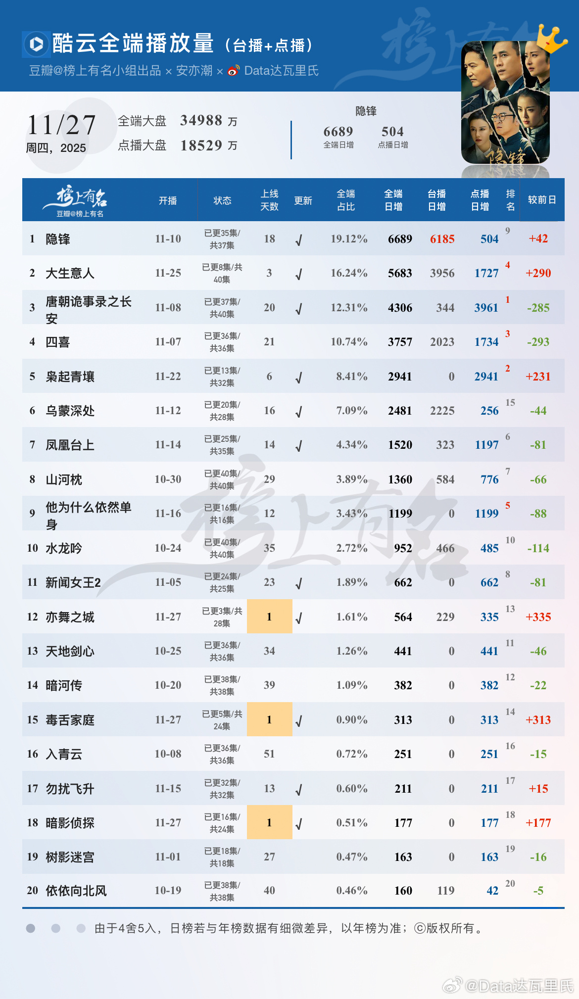 11.27酷云播放量🌴豆瓣榜上有名小组出品隐锋全端日冠×3;大生意人全端