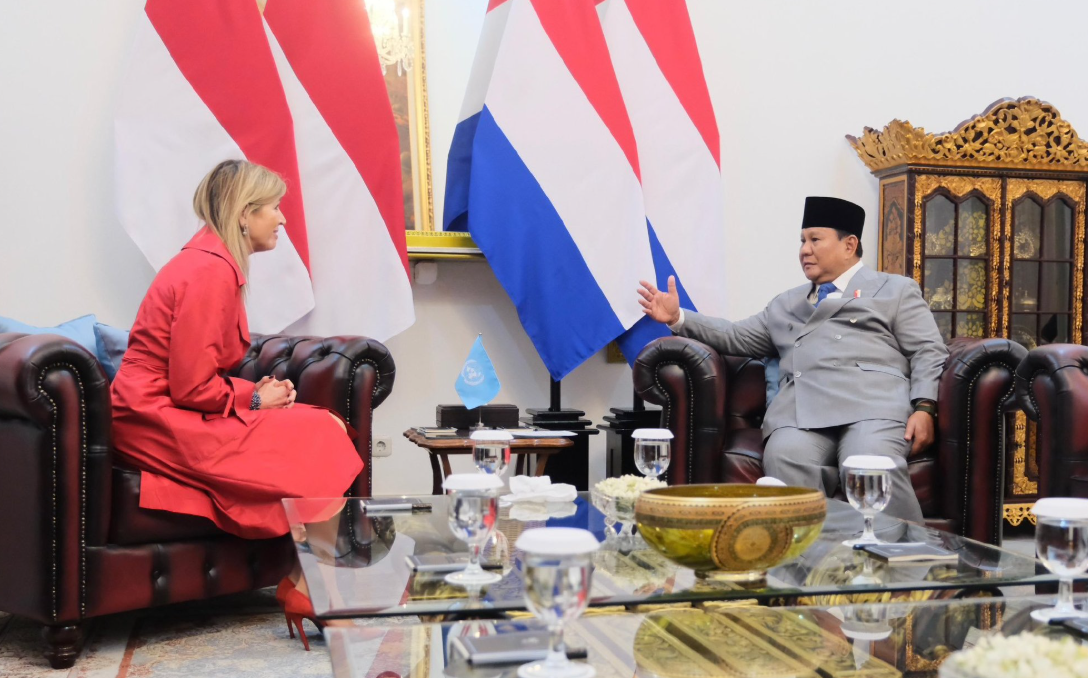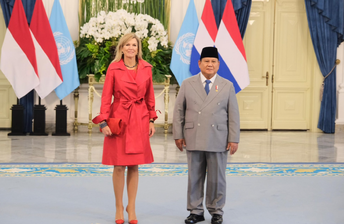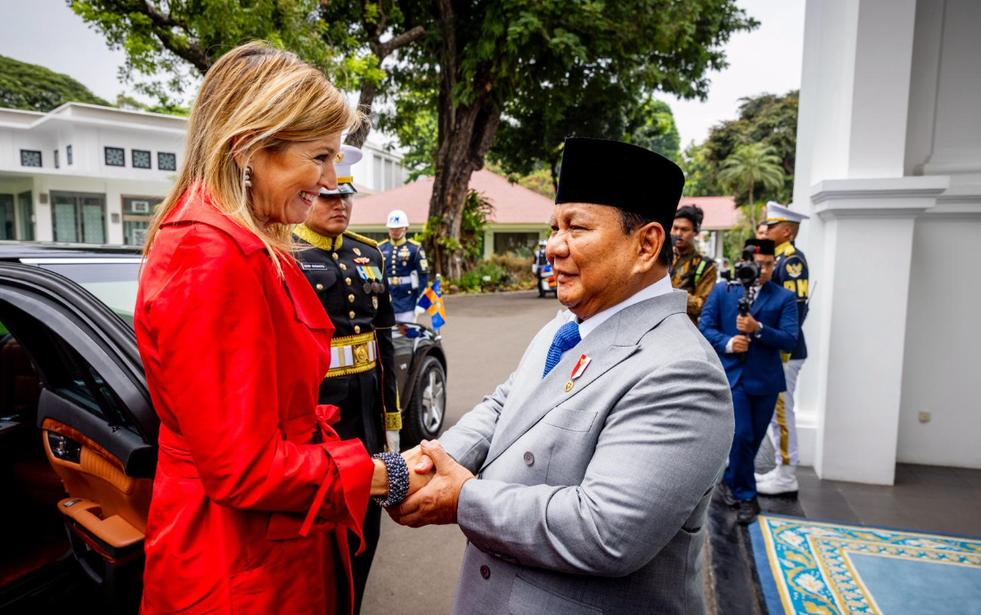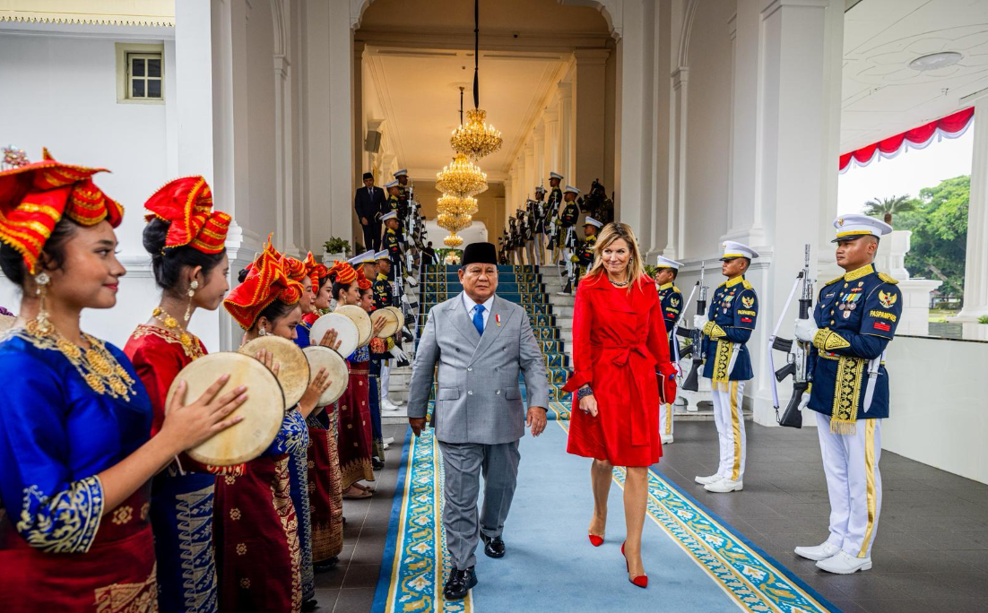 印尼总统接待荷兰王后!11月27日马克西玛王后访印尼第三天,受到了总统先生的热情欢迎,让人没想到的是印尼总统和王后陛下握手是用双手! 估计是为了表达热情欢迎,或者是印尼的礼仪,总统先生接待荷兰王后居然伸出双手去握着人家的手,要知道荷兰国王并不在场,感觉印尼总统有点儿过分热情了。 当天的玛克西玛穿红衣见印尼总统,红色风衣+红裙,就连手包与鞋子也是红色,一身全红色造型尽显高挑个头瞩目,衬托的印尼总昂头显娇小!