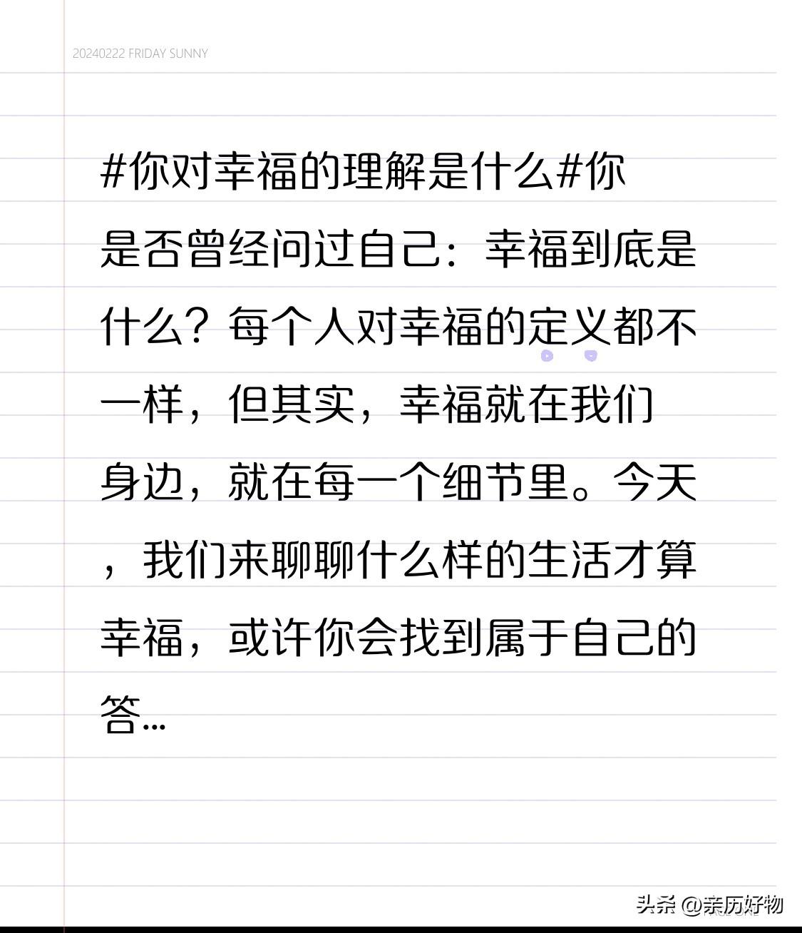 你是否曾经问过自己:幸福到底是什么?每个人对幸福的定义都不一样,但其实,幸福就在我们身边,就在每一个细节里。今天,我们来聊聊什么样的生活才算幸福,或许你会找到属于自己的答案。 有人说,幸福就是每天早上醒来,第一眼看到阳光洒在床头,暖暖的感觉让人心生满足。有人觉得,幸福是和家人在一起的温馨时光。比如,父母的笑脸、孩子的欢声笑语,这些简单的瞬间,才是真正的幸福源泉。 其实,幸福不一定要轰轰烈烈,它可以很平凡。比如,忙碌一天后,泡一杯喜欢的茶,坐在阳台上看书,听着鸟鸣,感受微风拂面,那份安静的满足,就是幸福。有人说,幸福就是拥有一份稳定的工作和收入,不用担心明天的生活,这种安全感让人心安。 当然,追求梦想也是幸福的重要部分。有人在追求自己喜欢的事业,无论遇到多少困难,都坚持不懈。成功的喜悦、实现自我价值的满足感,都是幸福的体现。其实,幸福也来自于不断成长和突破自己。 还有的人觉得,幸福是拥有朋友的陪伴。无论是开心还是难过,有朋友在身边,分享喜悦、分担忧愁,生活变得温暖而有意义。朋友就是生活中的调味料,让日子不再单调。 有些人追求的是自由和随性。随心所欲地旅行,去未知的地方探索,体验不同的文化,这样的生活也让人感受到幸福。旅行中的美景、美食、遇见的人,都成为人生中宝贵的回忆。 当然,幸福还包括健康。身体是革命的本钱,没有健康,一切都无从谈起。保持良好的生活习惯,合理饮食,规律锻炼,让自己每天都充满能量,这也是一种幸福。 有人说,幸福其实是一种心态。无论外在环境如何变化,保持一颗感恩的心,学会满足,懂得珍惜眼前的一切,生活就会变得更加美好。比如,遇到困难时,不抱怨,而是积极面对,从中学习成长,这样的心态让人更幸福。 其实,幸福没有固定的模样。有人在物质上满足,有人追求精神上的富足。只要你心中有爱,有希望,有目标,就能感受到幸福的味道。 我们常常在忙碌中迷失自己,忘记了幸福其实很简单。可能是一份热腾腾的早餐,也可能是一场久违的朋友聚会。幸福不一定要多么宏伟,它就在你我身边,就在你用心感受的每一刻。 所以,问自己:你觉得幸福是什么?其实答案很简单——那是你心中那份平静与满足,是你在平凡中发现的美好。只要心怀感恩,善待自己和身边的人,每天都可以过得幸福满满。 生活不完美,但只要你用心去感受,幸福就会悄悄降临。别让琐事困扰你的心情,学会欣赏身边的美好,幸福其实很简单,就藏在你我的每一个微笑、每一次努力、每一份真情里。 所以,别再问幸福是什么了。用心去生活,用爱去感受,你会发现,幸福其实一直都在你身边,等待你去发现、去珍惜。每天都可以是幸福的一天,只要你愿意去感受那份温暖和美好。 幸福不是遥不可及的梦想,而是你我每天的点滴。只要用心去生活,幸福就会在不经意间悄然降临。让我们都成为自己幸福的创造者,享受每一个平凡而珍贵的瞬间。 对幸福的感悟 幸福是什么 幸福最想要什么 幸福 幸福意义 幸福是什么味 感知幸福方法 个人幸福观 幸福是门必修课