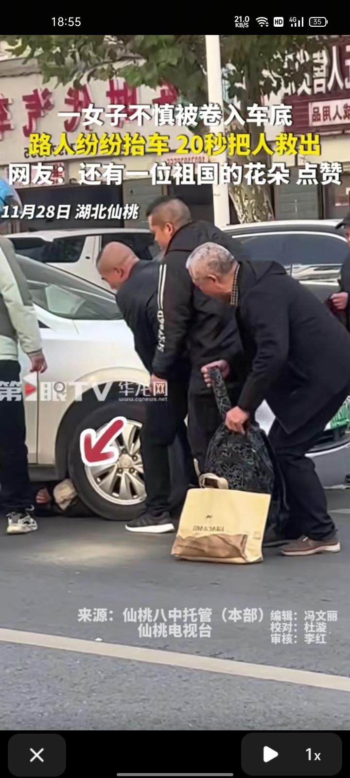 11月28日,湖北仙桃。网友发视频称,女子不慎卷入车底,路人们纷纷抬车,20秒把人救出。网友夸赞,有白发苍苍的老人、戴红领巾的小朋友,仙桃人民好样的!齐心协力,轿车升起!
