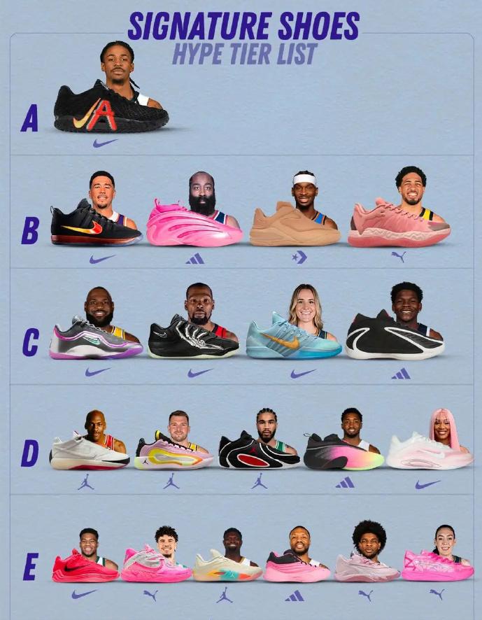 最新签名鞋热度榜单出炉:莫兰特的NIKE Ja 3霸占榜首! 布克2和哈登10都在的第二档,亚历山大的首款签名鞋SHAI001也紧随其后。 在销量上,2025年上半年,莫兰特的Ja 2就直接登顶,其中耐克标和字母“A”的设计组合,在市场上广受好评。 这就是市场一直追捧莫兰特的原因,他在场外烂事一堆,现在场上表现也一塌糊涂,但混不吝和特立独行的人设已经立住了,热度居高不下,每年的周边产品销量都是联盟前10,人的确不咋样,但是真有商业价值。