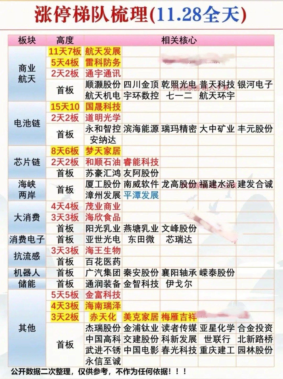 11.28周五 涨停板股票:题材分布!1.商业航天 12股涨停2.电池链 8股涨停3.芯片半导体 5股涨停4.海峡两岸 8股涨停5.大消费 5股涨停、
