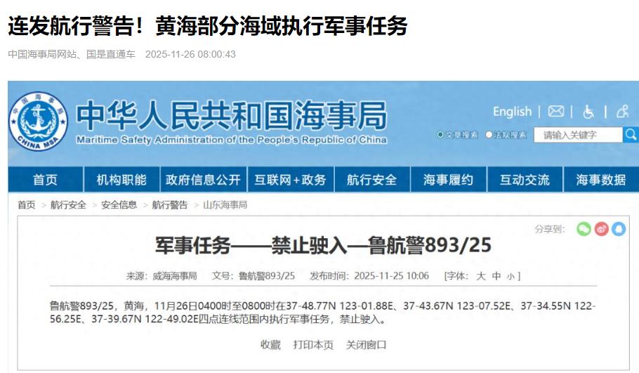 终于动真格了,不再打嘴仗了 这件事得从11月23号那天说起,中国海事局通过大连海事局发了个正式通告,明确说了从当天下午4点开始,到12月7号下午4点,整整两周时间,渤海海峡和黄海北部的一块海域要执行军事任务,任何船只都不能进。 四个精确到分的坐标点,严丝合缝框住了渤海海峡最核心的水域,这可不是随便在地图上画个圈玩玩,要知道渤海海峡可不是普通的海域,它是渤海通往黄海的唯一通道,相当于整个北方海域的“嗓子眼”。 同时,东北三省90%以上的外贸集装箱都得从这儿过,北京、天津的海上安全也全靠这道屏障守着,宽105千米、平均水深26米的海峡,被庙岛群岛分成14条水道,哪一条都容不得半点马虎,把禁航区精准定在核心区,本身就说明这次不是走个过场。 通告发出去没两天北海舰队就进场了,这效率也能看出来“不玩虚的”,以往偶尔也会有军事任务的通告,但大多是“点到为止”,这次不一样,从装备部署到现场管控,每一步都透着实战的架势。 而且别以为搞军事禁航就是“一刀切”断了所有航运,咱这次考虑得周全得很,之前可不是没吃过亏,2024年有艘英国籍的散货船,仗着船大就硬闯砣矶水道的军事禁航区,最后闹出来的索赔纠 纷至今还在打官司。 2025年7月更悬,一艘129米长的外籍油轮偏离航线,眼看就要冲进禁航区,还好烟台海事局的值班人员反应快,14分钟就喊话让它转了向,要是晚一步,不光军事任务受影响,附近的水产养殖区也得遭殃。 也正因为有这些前车之鉴,这次任务前就把功课做足了,给70米以上的外籍船舶划了智能电子围栏,只要靠近禁航区,系统立马声光报警,值班人员的手机还会收到短信提醒。 2025年上半年烟台辖区的军事禁航区已经实现了“零穿越”,这可比喊十句“禁止驶入”都管用。 并且这次任务把“回应外部挑衅”落到了实处,以前面对一些别有用心的外轮违规,顶多是口头交涉几句,对方转头该咋来还咋来,毕竟光靠嘴说,既没威慑力也没约束力。 但这次不一样,直接划定实打实的禁航区,北海舰队进场后,不管是日常巡逻还是实战演练,都是按最高标准来,相当于把“底线”直接摆到了明面上——这片水域是咱的核心区,别想着耍小聪明闯进来,真来了也没好果子吃。 而且咱也不是只顾着“硬气”,还兼顾了生态保护,渤海海峡里光是浮游植物就有147种,游泳动物150多种,任务前早就摸清了这些生态点位,演练全程避开了核心繁殖区,既完成了军事任务,又没给海洋生态添乱,这份周全,可不是光靠打嘴仗能做到的。 说到底,这次15天的军事任务,从精准划定禁航区,到舰队快速进场,再到对航运、生态的全方位考量,每一步都踩在了“实处”上。 以前总有人说咱只会“打嘴仗”,但这次用实际行动证明,咱不是不会硬气,只是不轻易亮底牌,真到了该动真格的时候,不管是划定坐标的精准度,还是应对突发情况的速度,亦或是对外部挑衅的回应力度,都让那些想钻空子的人没了可乘之机。 这比任何天花乱坠的口头警告都来得实在,也让所有人都看清,咱守护自家海域的底气,从来都不是靠嘴说,而是靠实打实的部署和行动。