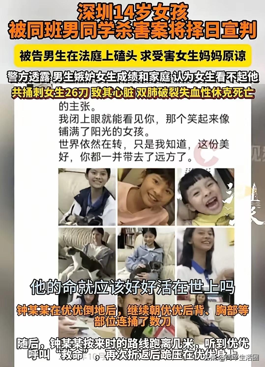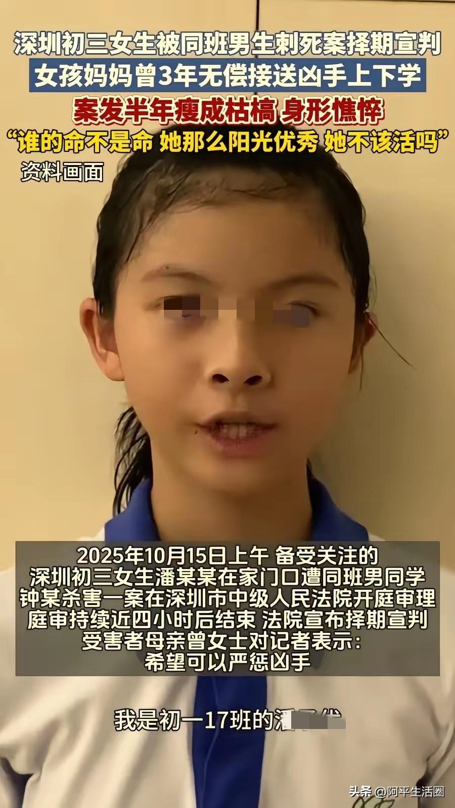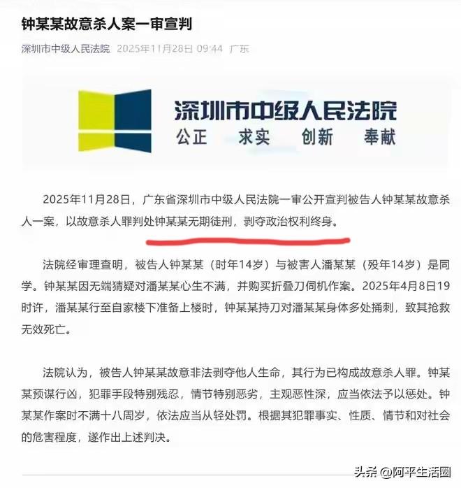 果不其然, 深圳14岁男生钟建川杀害女同学案,一审被判处无期徒刑而不是死刑。 看看他作案前都干了什么,大家就明白了。提前上网搜法律条文,明知未成年不会判死刑,就肆无忌惮捅了同班女生26刀,刀刀致命,女孩呼救时还补刀,这份冷酷狠毒,根本不像一个14岁的学生。 一审无期徒刑,看似顶格处罚,可在受害者妈妈眼里,这根本不是正义!无期徒刑不是终身监禁,早晚都能出狱,凶手还能重启人生,而无辜的潘同学,却永远停留在了最美的年纪,再也回不来了。 最让人齿冷的是,凶手从预谋到行凶,每一步都透着精心算计。搜“杀脖子会活多久”,查未成年人保护法漏洞,这份早慧的恶,比成年人犯罪更让人毛骨悚然。法律本是保护弱者,却成了恶魔的“免死金牌”,这让受害者家属怎么接受? 女孩妈妈哭到崩溃要抗诉,谁看了不心疼?养了十几年的宝贝女儿,被人残忍杀害,凶手却不用付出生命代价,甚至还有机会重获自由。这样的结果,既告慰不了逝者,也震慑不了潜在的恶行。 希望抗诉能有结果,让凶手得到应有的严惩,真正做到罪刑相当。不然,每一次这样的判决,都是对受害者的二次伤害。 大家觉得呢?