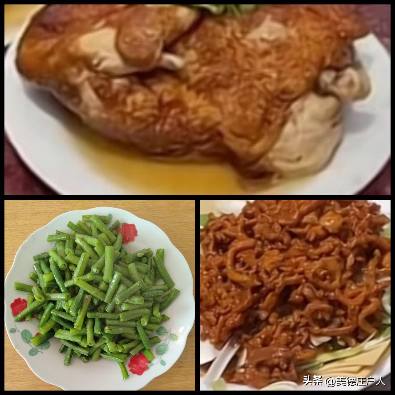 晒图前先写两首诗,看一下能否写透人生! 南乡子.史韵豪情(一) 三千年读史,不外乎功名利禄。多少纷争如电速,惊目,血火刀光染旧牍。 豪杰志难伏,仗剑天涯绘锦图。铁马金戈征战处,高呼,青史留名耀九衢。 南乡子.归处桃源(二) 九万里悟道,不外乎诗酒田园。野鹤闲云伴岁年,安然,菊影梅香绕舍前。 世事任风传,不与纷嚣竞短长。浊酒清诗同雅趣,疏狂,醉卧林泉忘世缘。 今天中午家里来了几位老友,顺手做了几盘菜,第一图是美国总统的特朗普守着两只热狗,他就好这一口,生活就不如咱庄户人家的菜丰盛了。 第一组配图上方为半只烧鸡,下边为清炒豆角和一盘滑溜肉丝。 第二组上方为汤菜,下方为辣椒丝炒肉和肉炒扁豆丝。 第三为拼盘,下层为火腿片,上面为松花蛋,再上面为自制八宝醮料,基本按炸酱面的方法制成。 另一组下方是蒜蓉炒海带丝,而上面的是春天制作的一道甜品,叫蜜制枇杷,是经过无菌制作后,密封放冰箱冷藏。 几位儿时的好友边吃边谈,谈的都是儿时的回忆,最多的话题都在南乡子中包括了。
